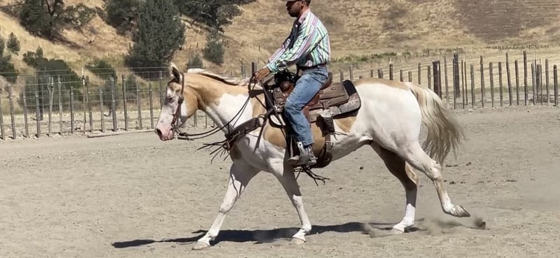 ONLINE AUCTION PLACE YOUR BIDS AT PLATINUMEQUINEAUCTION DOT COM $3500 STARTING BID AUCTION ENDS JUNE 30TH We are proud to introduce this beautiful palomino paint gelding. He is 11 years old,14.3 hands tall and picture perfect. Dice has everything you could want all in one package. Dice rides like one should low headed collected and very correct. Dice is a friendly, easy horse and is accommodating for all level riders. He is absolutely safe and knowledgeable horse and will adapt for his riders ability. He is luxurious, comfortable and stylish! He has a resume a mile long from every day ranch duties, to rodeos, head horse, family horse, sensible trail companion you name it he will do it. Dice is super broke spins, slides and has elegant transitions in his gaits. He has had natural horsemanship training and is very soft and supple on the ground as well as on his back. He gives off pressure very well he will flex both directions and at the poll. He is the kind of horse you can trust! He will run a cow down, then turn around put the kids on him and he will slow walk all day long he is the most versatile horse you will ever be lucky enough to swing your leg over. He is absolutely gentle. Dice side passes, pivots and has a rocking chair lope you can sit for days. He is good to catch great for the farrier, loads and unloads with ease, stands tied, easy to saddle and bridle. Dice has gathered cattle in steep country and will cross anything you may come across, brush, downed trees and cross the deepest water. Dice is amazing on the trail and just puts his head down and goes with the flow. He has been in some ranch trail and goes over the teetering bridge, over the tires, logs, covered wagon with ease and confidence. He has been rode down busy streets, carried flags and doesn’t mind tarps or balls whatsoever. Dice will fit the everyday cowboy or the leisurely trial rider. Due to his gentle demeanor he will fit a family that needs a horse that different abilities can ride. Dice is a very easy going gelding that makes him such a pleasure to have around. He is at the prime of his life and has so much knowledge it is truly priceless. Dice has absolutely no vices he is solid sane and an a very intelligent horse. We have truly enjoyed every minute of owning this beautiful gelding and he will be greatly missed. We know he will be the absolute barn favorite wherever he goes. He has a friendly disposition and will steal your heart. Please feel free to call and make an appointment to come meet him or with any questions you may have contact Longhorn Ranch Dina 831-537-1915 Located in Paicines Ca