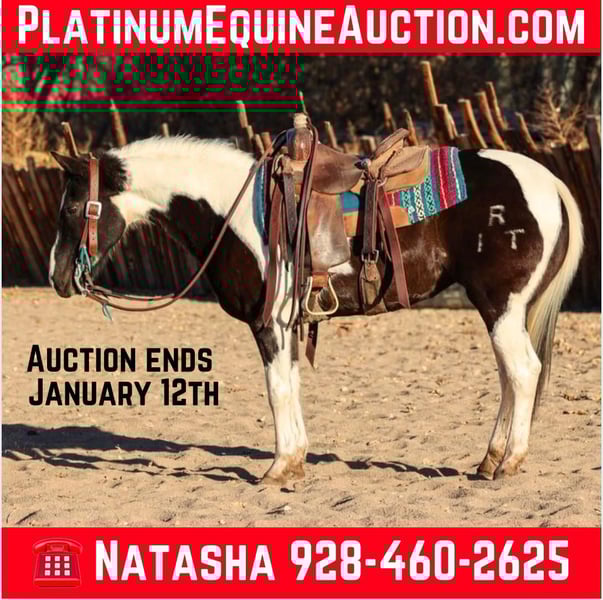 ONLINE AUCTION Place your bids at www.PlatinumEquineAuction.com Starting Bid $3500 Auction ends January 12th, 2024 Need a new saddle? Check out White Rock Saddles on our website or Facebook! PollyPocket is a 12 year old grade paint mare standing 14.2hh. Whether you’re looking for a leisurely ride down the trail or to go play around in the arena, PollyPocket is your gal! This well rounded mare will go absolutely any direction you point her on the trail, as well as walk, trot, and lope both ways in the arena. PollyPocket has been used as a step-up lesson horse for kiddos ready to pick up the pace a bit. This gorgeous mare is gentle, and safe but does move with a sense of purpose. PollyPocket would make a great playday, gymkhana, or trail horse!!! Easy to catch, groom, saddle, bridle, bathe, and shoe! PollyPocket will come with a clean coggins and health, as well as a lameness exam. Transport can easily be arranged anywhere in the US!!! Located in Camp Verde, AZ Contact D/C Equine Services Natasha 928-460-2625. ONLINE AUCTION Place your bids at www.PlatinumEquineAuction.com Starting Bid $3500 Auction ends January 12th, 2024 Need a new saddle? Check out White Rock Saddles on our website or Facebook!