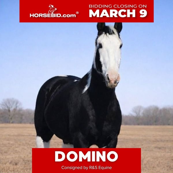 ℳ𝒶𝓇𝒸𝒽 ♦️𝐑𝐈𝐃𝐄𝐑'𝐒 𝐂𝐇𝐎𝐈𝐂𝐄♦️ Happening now thru MONDAY | MARCH 9th - Available EXCLUSIVELY on HorseBid's website! For more details and to register visit: www.Horsebid.com CONSIGNOR CONTACT: R&S equine 641-895-1215 LOCATION: Hamilton, IA BREED: Paint REGISTERED: No REGISTERED NAME: Domino COLOR: Black/white HEIGHT: 15.2 AGE: 14 GENDER: Gelding 🤍🩶🖤Domino🤍🩶🖤 🌟14 Yr Old Grade Paint Gelding🌟 15.2h If you’re looking for a dependable, been-there-done-that type, here he is! Domino is a 14 year old grade paint gelding stands 15.2 hands and is broke to ride for just about anyone. He’s the kind you can enjoy whether you’re a beginner wanting something safe or an experienced rider wanting something reliable. Domino will ride one-handed with a nice neck rein, has a good stop, backs up willingly, and will walk, trot, and lope both ways with no issues and knows his leads. He is definitely more “whoa” than “go” and takes care of his rider. Domino has seen miles and miles of trails and will cross absolutely anything you point him at — logs, ditches, water, mud, hills — you name it. He’ll confidently step over and across obstacles like bridges, teeter totters, tires, and more without hesitation. He’s dog friendly (we always ride with dogs) and couldn’t care less about them being around. He’s been ridden through town and is traffic safe. You can pony colts off him with ease, and he’s even been used to drag deer for hunters. He’s worked cattle and penned them back at the sale barns and isn’t phased by any of that one bit. Domino has also been in parades and carried a flag and been rode around at the chuckwagon races! He handles all the chaos very calmly Low man in the pecking order, easy to catch, and easy to have around the barn. He stands excellent for the farrier and to be tacked up. He has a fresh set of shoes on and takes the bit well. Up to date on shots and dewormer. Domino is a solid, honest gelding that’s ready to keep being someone’s go-to partner.