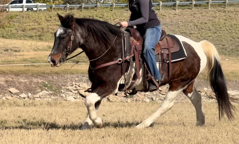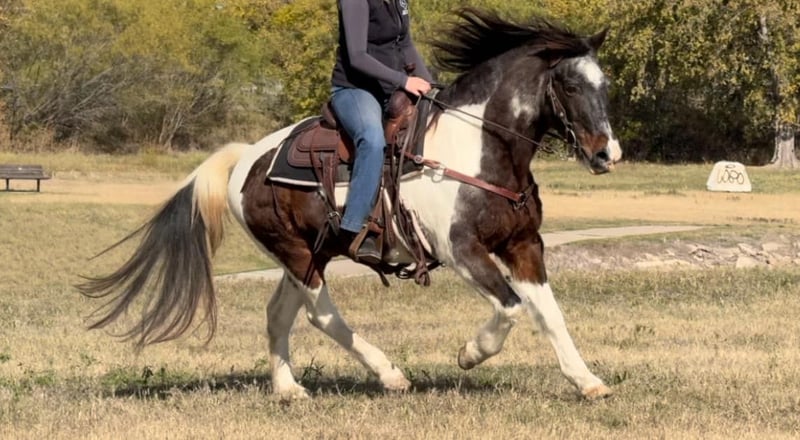 ONLINE AUCTION Place your bids at www.PlatinumEquineAuction.com Starting Bid $3500 Auction ends December 22nd, 2024 Need a new saddle? Check out White Rock Saddles on our website or Facebook! Barnaby is a 13 yr old 14.1 hand bay roan and white paint gelding that everyone is sure to fall in love with! If you need one that rides like a COUCH, this guy is for you!! He is absolutely comfortable at all gaits and his lope is like riding a stick of butter! He has spent his days raising up kids that are now ready to move onto the step up performance horses. Barnaby is gentle gentle gentle and if you can hold the reins you can ride him! He’s broke like one should be which will make the beginner kids fall in love with riding! He neck reins with ease and moves off leg great! He has all the buttons, picks up both leads and stops right when you ask him to! He was used for play days, trails, pleasure rides and he has also pushed cows and roped the dummy! Barnaby would be the perfect kids play day horse, lesson horse or trail horse for any novice rider, older rider, or beginner that’s looking for a safe mount! He has absolutely ZERO buck bolt or rear and is easy to get along with in all aspects! He loads, leads, bathes and ties like a saint and he is UTD on teeth, feet and coggins! He has a huge loving personality and is sure to make anyone he meets smile! Barnaby is has a really cool bay roan color and definitely stands out from the rest! He has everything going for him that you could ever need in a beginner / kid safe / trail horse! Don’t miss this COMFY, easing going guy the whole family is sure to love! Watch his FULL video and go to his website page northtexashorsecompany.com/barnaby for more pictures and footage! Please call Blair with North Texas Horse Company for more info at 817-757-3046. We LOVE to talk about him! We are located in Weatherford, TX and can help arrange affordable shipping to anyone!! ONLINE AUCTION Place your bids at www.PlatinumEquineAuction.com Starting Bid $3500 Auction ends December 22nd, 2024 Need a new saddle? Check out White Rock Saddles on our website or Facebook!