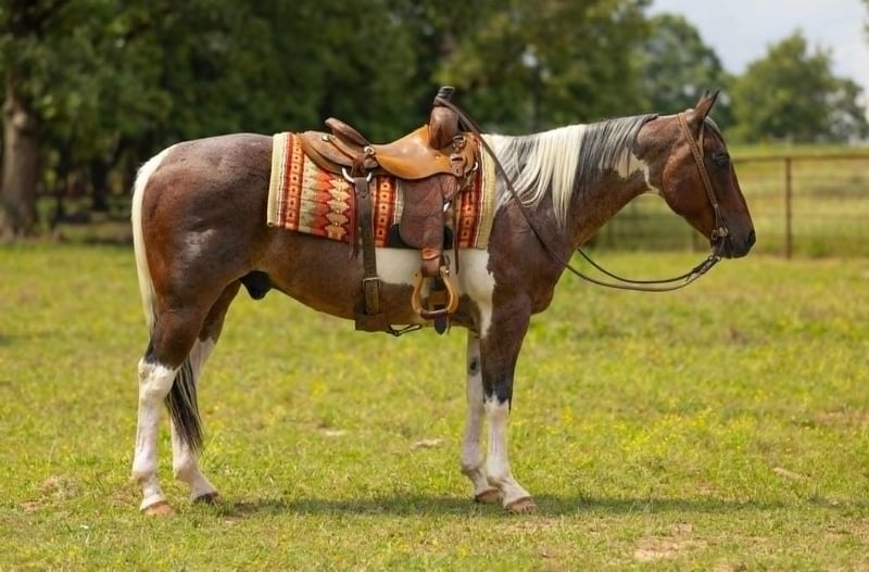 ONLINE AUCTION Place your bids at www.PlatinumEquineAuction.com Starting Bid $3500 Auction ends June 29th, 2025 Need a new saddle? Check out White Rock Saddles on our website or Facebook! Being offered for your consideration is Banks, a 14.2h, 14-year-old bay roan paint gelding with a wealth of real-world experience and a quiet, dependable disposition. This gelding is an ideal candidate for anyone in need of a seasoned, all-around mount who is both willing and capable in a wide range of environments. Banks has been extensively used in a working cattle setting, including time at the sale barn where he has reliably sorted, pinned, and loaded cattle. He is no stranger to pressure and commotion, and he handles both with calm professionalism. In addition, he has been ridden at wagon races and exposed to high-energy events, taking it all in stride without becoming reactive or unsettled. Under saddle, Banks is confident, sure-footed, and smooth. He will go out alone or with a group, crosses water, navigates rough terrain, and handles obstacles with ease. He has been ridden through town, where he has encountered traffic, dogs, bicycles, and other typical urban distractions. Banks remains composed and attentive throughout. He is also comfortable being ridden bareback or double, further showcasing his gentle nature and versatility. On the ground, Banks is easy to catch, saddle, bridle, bathe, and load. He stands quietly for grooming and farrier work and has excellent manners in the barn and trailer. Banks is the kind of horse that brings peace of mind—whether you’re heading out for a long day of work, a quiet evening ride, or anything in between. If you’re looking for a reliable, seasoned gelding with a calm presence, Banks deserves your consideration. Located in Quitman, AR. Contact Diamond L Horses Cole 479-747-3179 with any questions. ONLINE AUCTION Place your bids at www.PlatinumEquineAuction.com Starting Bid $3500 Auction ends June 29th, 2025 Need a new saddle? Check out White Rock Saddles on our website or Facebook!