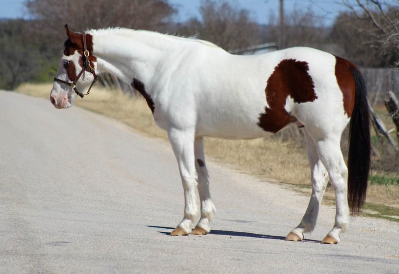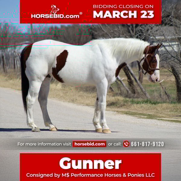 ⚜️𝓽𝓱𝓮 𝐆𝐎𝐋𝐃 𝓢𝓮𝓵𝓮𝓬𝓽⚜️ Happening now thru MONDAY | MARCH 23rd - Available EXCLUSIVELY on HorseBid's website! For more details and to register visit: www.Horsebid.com CONSIGNOR CONTACT: M$ Performance Horses & Ponies LLC 661-817-9120 LOCATION: Whitesboro,TX BREED: Paint Horse REGISTERED: No REGISTERED NAME: Gunner COLOR: Bay and white overo HEIGHT: 15 AGE: 15 GENDER: Gelding Gunner is a 15 year old paint gelding standing 15 hds tall and boy is he flashy with his unique markings. He is one that’s going to stand out! Gunner has covered serious country — miles and miles of trails, different states, camping trips, rough terrain, water crossings, rocky climbs, thick brush — you name it. He’ll ease along on a loose rein, happily walk all day, or step into a trot or lope if you want to cover ground. He crosses water without hesitation (he loves to splash around in the water), steps over logs, crosses bridges, and handles new places with a steady mind. He’s even taken in the sights and sounds of the historic Fort Worth Stockyards without missing a beat. In the arena, he keeps it simple and solid — easy neck rein, smooth transitions, and a stop that’s dependable. Nothing fancy, just broke the way one should be. He’s user friendly and easy to ride not one you need a handbook on. He stands tied, good for the farrier (currently barefoot ), loads and unloads easy. We are open to anyone interested in him to schedule a time to come see him or if you can’t make it schedule a FaceTime showing to see him. If you need help with transport don’t hesitate to ask we have a list of reputable haulers that can get him safely to your doorstep WORLD WIDE including, Alaska , Mexico, Hawaii, Canada and anywhere in between.