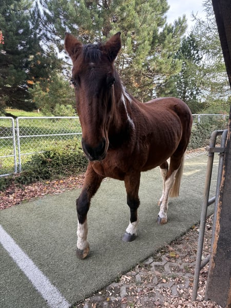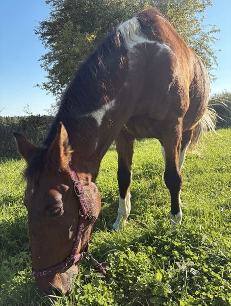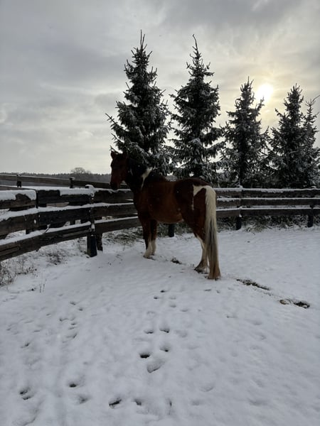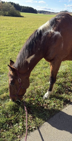 This kind-hearted 19-year-old Paint Cross gelding is looking for a 5-star home with a loving carrot giver! Due to a personal hardship, I am heartbroken to seek a 5-star home for my little treasure. No dealers or commercial interests, please. He is strictly sold as a companion horse! Frequently asked questions: Is he rideable? -> He has not been ridden for several years. Does he have any health issues or limitations? -> He has a soft fetlock on his right hind leg, which he relieves especially in winter. However, he has no restrictions or other issues. According to the veterinarian, movement is beneficial for him. I have never had any problems with it. He also moves without issues. Due to the soft fetlock, he is not a weight carrier. He is capable of covering long distances comfortably; the longest I recently walked with him was 15 km. He has only ever been a pasture horse with me and has not been ridden. He impresses with his absolutely relaxed, calm, and friendly nature. An absolute gem with a big heart. He will do anything for carrots and treats. He loves going for walks and being pampered. His height is approximately 16.1 hands. I wish for him a home where he can simply be a horse. He is very uncomplicated, completely social, and easy to get along with. He would be the perfect companion horse! He is used to box stalls with daily turnout and an open stable. Since movement is very good for him, an open stable would be ideal! Absolutely priority for space over price! I also have two blankets that can be included, as well as various feed. If you have questions or are interested, please contact me and come to see him. No leasing or other arrangements! My health is deteriorating, and time is running out. Pickup before January 6th = €100 Friendship price! He is worth much more normally. I just want to find a loving home for him. Money is absolutely no issue.