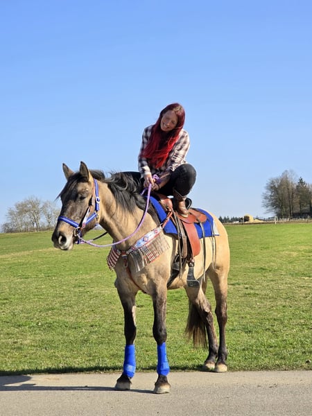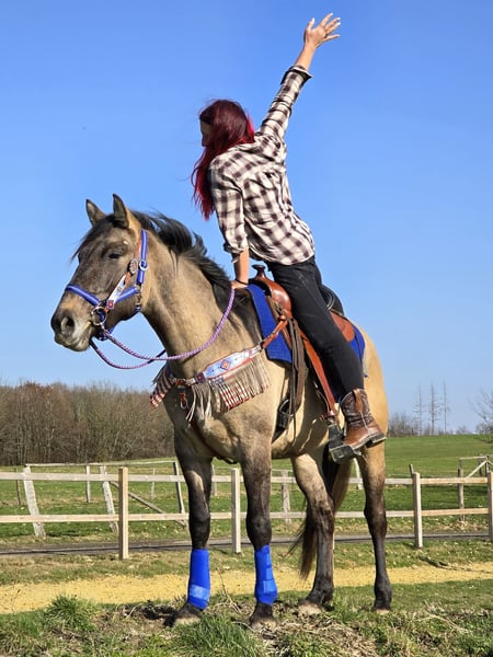 Westerntyp Wallach – jung, brav & mit toller Basis NANO ist ein Sonnenschein ! Alter: 3 Jahre Er hat ein halbes Papier , Paint-Horse Stockmaß: ca. 152 cm (noch im Wachstum) Preis: 6900,- AKU: vorhanden ✨ Beschreibung: Dieser 3-jährige Westerntyp Wallach überzeugt mit seinem kompakten, harmonischen Gebäude und seiner ruhigen Art. Er ist bereits angeritten und zeigt sich dabei sehr brav, aufmerksam und lernwillig. Für sein junges Alter bringt er eine tolle Einstellung zur Arbeit mit. Unter dem Sattel bleibt er gelassen, gibt sich Mühe alles richtig zu machen und vermittelt ein angenehmes Reitgefühl. Im täglichen Umgang ist er freundlich, unkompliziert und gut erzogen. Aktuell misst er ca. 152 cm und befindet sich noch im Wachstum – ideal für alle, die sich ihren jungen Partner weiter ausbilden möchten. Ein vielversprechender Nachwuchswallach mit bester Grundlage für den Freizeitbereich und die weitere Western-Ausbildung. Geeignet für: Reiterinnen und Reiter, die Freude daran haben, ein junges Pferd weiter zu fördern. Ideal als zukünftiges Freizeit- oder Westernpferd. Unsere Pferde werden regelmäßig: – entwurmt – vom Schmied betreut – osteopathisch kontrolliert Hofladen: Westernsättel, Trensen & Zubehör Transport sowie passendes Equipment auf Wunsch günstig organisierbar Unser Service: ✅ 3 Monate Umtauschrecht ✅ Proberitt: 35 €, jedes weitere Pferd 25 € (beim Kauf am selben Tag angerechnet) ✅ 100 € Sofort-Rabatt bei Abholung oder Transport am gleichen Tag ✅ Persönliche & ehrliche Beratung Anfragen bitte ausschließlich telefonisch: 0171 – 4001968 Erreichbar täglich von 8–20 Uhr ⚠️ Keine E-Mail oder WhatsApp ⚠️ Alle Angaben ohne Gewähr