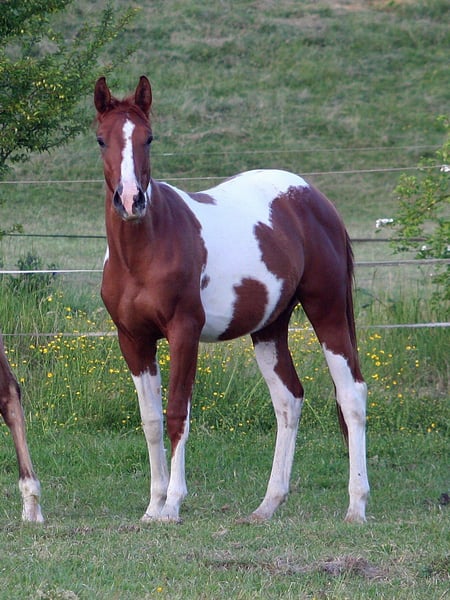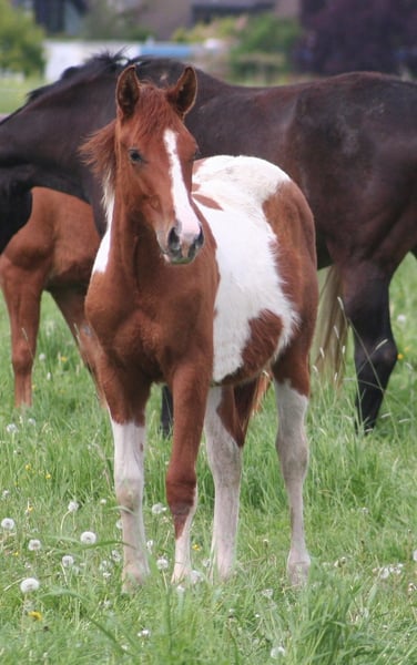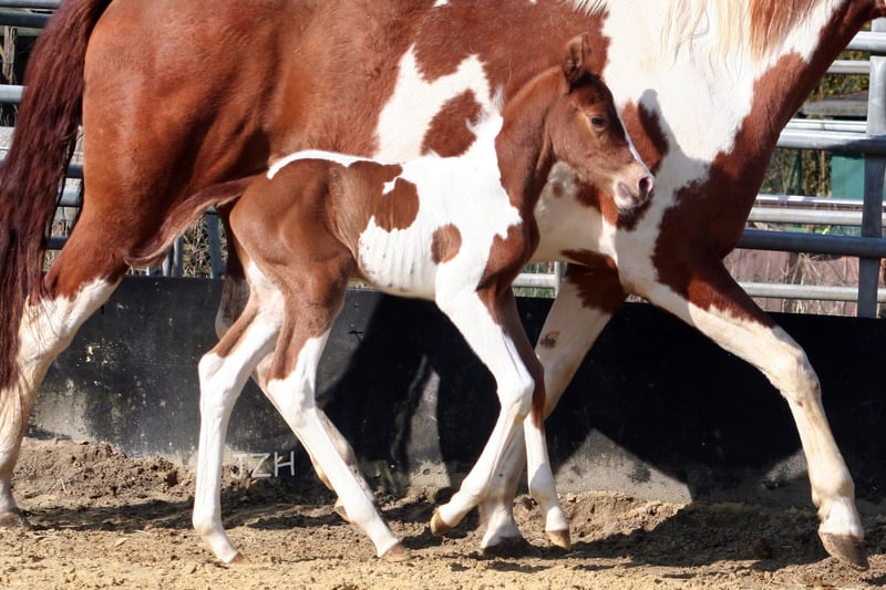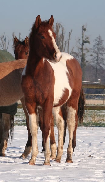 Beautiful Paint Stallion. Very friendly and people-oriented. Good basic gaits. Evenly drawn with 2 dark eyes. Father is licensed at the PHCG. Dam is also awarded as the champion mare of the breed show. In the pedigree there are sires such as Merada Chex, Doc Chex, Yellow Mount, Sugar Bars, Doc Quixote and Smart Chic O Lena. Grows up in herds. 5Panel test by parents With PHCG passport and American papers. Please contact us by phone at 0175/7217229
