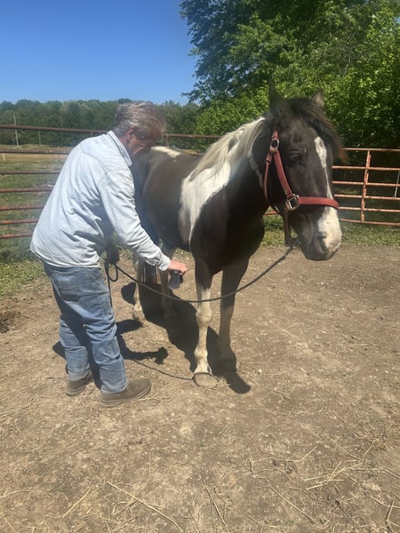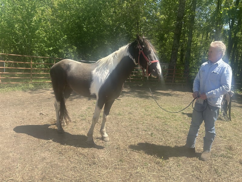 Czarny/biały wałach rasy Paint, potencjał na konkurencje barrelowe