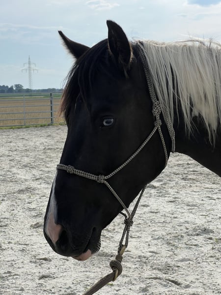 Nics Blueberry Gun – eine sanfte Schmusebacke, die alle Blicke auf sich zieht – mit seinem ausdrucksstarken Blick und seiner unverkennbaren Scheckung. Der am 26.04.2022 geborene American Paint Horse Wallach begeistert jedoch nicht nur optisch, sondern überzeugt auch durch seine hohe Qualität. Dies stellte er bereits früh unter Beweis, als er auf der Zuchtschau als Siegerfohlen prämiert wurde. Blue ist aktuell ca. 1,54 m groß und ein schwarz-weißer Tobiano mit vielen kleinen Spots. Besonders auffällig sind seine Augen – eines blau, eines dunkel. Sein Vater ist Dancers Smokin Gun. In seiner weiteren Abstammung finden sich bewährte und bekannte Quarter- und Painthorse-Namen, unter anderem Nics Peppy Train, Shotgunner, Doc O’Mount, Doc Chex, Little Pep Olena und Dancing Snow Boy. Als Züchter ist es uns schon immer besonders wichtig, unsere Pferde nicht schnell und günstig „durchtrainieren“ zu lassen, sondern ihnen die Zeit zu geben, die sie für eine gesunde körperliche und mentale Entwicklung benötigen. Blueberry wurde von Beginn an nach den Prinzipien des Natural Horsemanship begleitet. Im Februar 2025 startete eine systematische Bodenarbeit durch eine NHS-Trainerin. Darauf aufbauend wird er seit November 2025 durch einen Parelli-Instruktor und Horse Development Specialist schonend unter dem Sattel weiter ausgebildet und er entwickelt sich zu einem ruhigen, liebevollen und zuverlässigen Partner. Dabei gibt Blue natürlich selbst das Tempo vor. Neue Inhalte nimmt er jedoch bislang gelassen, vertrauensvoll und ohne Abwehr- oder Stressreaktionen an. Seine Ausbildung zeichnet sich durch Ruhe, Klarheit und eine feine Kommunikation aus. Sein ruhiges Wesen macht ihn zu einem angenehmen Partner im täglichen Umgang. Aufgrund dieses Charakters ist er auch gut für einen Jugendlichen geeignet, sofern dieser begleitet und unterstützt wird – und damit ideal für Familien, die Wert auf Sicherheit, Vertrauen und eine harmonische Beziehung zum Pferd legen. Perspektivisch eignet sich Blueberry sowohl als verlässlicher Freizeitpartner als auch für eine weiterführende sportliche Ausrichtung, je nach Wunsch und Ziel seiner zukünftigen Besitzer. Durch seine ehrliche und entspannte Art eignet er sich unserer Meinung nach auch sehr gut dafür, vom neuen Besitzer selbst weiter ausgebildet zu werden. Nach Absprache ist aber auch eine weitere Begleitung oder weiteres Training durch unseren Trainer möglich. Wir wünschen uns für ihn ein Zuhause, wo seine behutsame Ausbildung weitergeführt und der gemeinsame Weg mit Geduld, Respekt und Freude fortgesetzt wird. Weitere Videos und Fotos vorhanden. Wir bitten um telefonische Kontaktaufnahme.