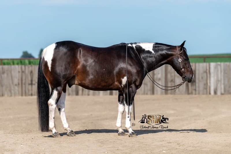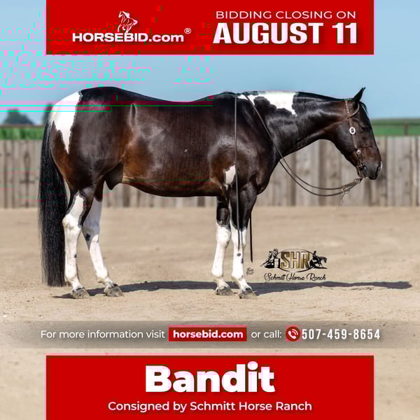 ⚜ The HERITAGE Classic ⚜ Happening now thru MONDAY | AUGUST 11th - Available EXCLUSIVELY on HorseBid's website! For more details and to register visit: www.Horsebid.com CONSIGNOR CONTACT: Schmitt Horse Ranch 507-459-8654 LOCATION: Holland, IA BREED: APHA REGISTERED: Yes REGISTERED NAME: Hashtag Blessed COLOR: Black Tobiano HEIGHT: 14.3 AGE: 5 GENDER: Gelding “Bandit” is a striking paint gelding that stands 14.3 hands tall and is built like a tank — thick, muscular, and correct. This unique gelding is by Hashtags out of a daughter of Thomas E Hughes! He is a finished cutter and has won $2,323 NCHA. 2024 APHA World Championship Show Jr Cutting Reserve Champion, marking a 220.5. Also marked a 217 in the 4-Year-Old Limited Open at the 2024 NCHA Super Stakes. Bandit is super gentle and a pleasure to be around. He stays trained, and is youth/amateur appropriate in the cutting pen. This is a super cool, one-of-a-kind individual that checks all the boxes - talent, looks, experience, and temperament. Bandit has also been ridden on the trails, been through our thorough desensitizing program, and has been roped on by the previous owners. This guy is versatile and can do about anything that’s asked. Bandit is super fun on the flag as well, and definitely doesn’t have to be tuned on daily to remember his job. He is smooth moving and has the softest rocking chair lope that you’ll ride. Bandit has a fancy handle with all the bells and whistles. Hauls, loads, stands tied, bathes, and stands great for the farrier. Great in a stall or outside, super easy going and gets along with other horses. I believe about anyone who can climb up in the saddle should be able to get along with this guy. With his sweet, charming personality, quick and catty moves on a cow, smooth rocking chair lope, and jaw-dropping good looks — Bandit is the kind of horse you can’t help but fall in love with! Current on deworming, farrier, vaccinations, basic pre-purchase exam, and coggins. For more information give us a call 507-459-8654. Bandit is located in Holland, Iowa. We welcome test rides prior to the auction ending as well and free board within a reasonable time frame after purchase until shipping arrangements can be made.