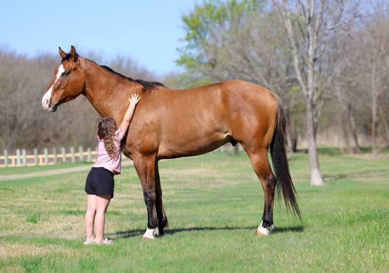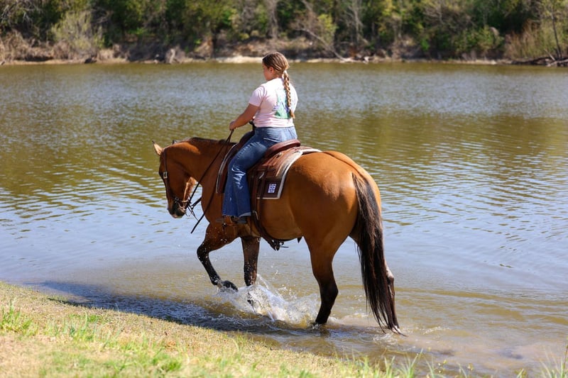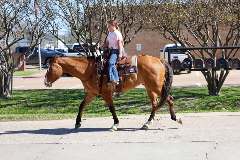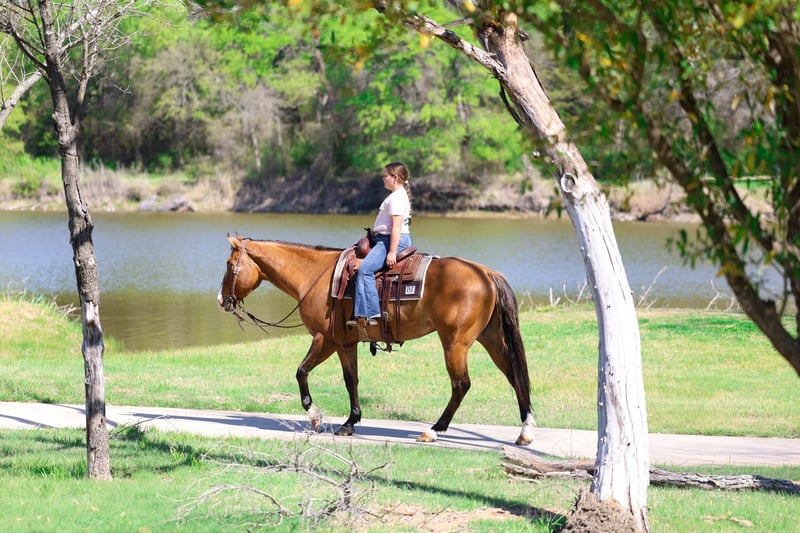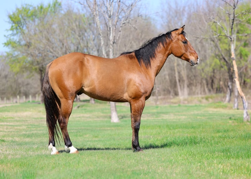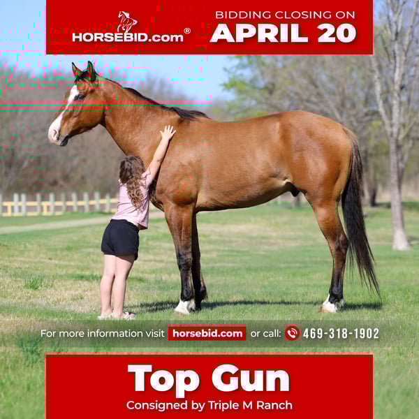 ⚜️𝐭𝐡𝐞 𝓔𝓵𝓲𝓽𝓮 𝐒𝐩𝐫𝐢𝐧𝐠 𝐂𝐥𝐚𝐬𝐬𝐢𝐜⚜️ Happening now thru MONDAY | APRIL 20th - Available EXCLUSIVELY on HorseBid's website! For more details and to register visit: www.Horsebid.com CONSIGNOR CONTACT: Triple M Ranch 469-318-1902 LOCATION: Talty, TX BREED: APHA REGISTERED: Yes REGISTERED NAME: CHICS DIG THE NITE COLOR: Dun HEIGHT: 15.2 AGE: 5 GENDER: Gelding ✈️ Top Gun is a 5 yr old 15.2 hands tall Registered Line Back Dunn Gelding!! This well bred gelding has some of the greats on his papers. Including Colonels Smokingun, Hollywoodstinseltown, High Brow Cat, BH Top Gun. He is bred to be an outstanding horse. He is at the prime age a ready to go on and do big things. He has an excellent foundation in his training. He has all the bells and whistles. He has been very well started and lightly shown the ranch versatility classes, the ranch and the trail courses. He is extremely honest and willing to please. He is naturally quiet and easy going. From his jog to his little silky lope. He packs his head low and level without any fuss or resistance. ✈️ He is also amazing out on the trails and riding through town! He is not at all spooky or bothered by things like wildlife or common things one might see on a trail ride or in town. Like traffic, bikes, motorcycles, lots of people. He quiet riding anywhere in the pack and he stands tied at the trailer for tacking and untacking like a perfect gentleman. Absolutely no bad habits whatsoever!! You do not have to warm him up or tune him up to go for a ride. He is easy and fun to ride. ✈️ No matter which direction you decide to take this handsome boy he is ready and willing. At just 5 yrs old he has his whole life ahead of him. I would say he is suitable for any level and any age rider. From beginners all the way up to an advanced rider. This gelding has been nothing short of amazing for us. Plus the best part is he has the most amazing, in your pocket personality with an "old soul" disposition! He loves people and attention. Loves kisses and muzzle scratches. He will lay his head on your chest and just close his eyes getting loved on! If ever there was a young horse suited for a novice to ride and show.. this would be him! ✈️ He is a super easy keeper. Requires no maintenance of any kind. He can go bare foot or put shoes on him. You can stall him or turn him out. Doesn’t matter to him. He is easy. PLUS he sells 100% sounds with no issues. He did have a pre vet evaluation done included in the pictures. If you have anymore questions about him feel free to call. We would love to visit with you about him. We can help you arrange shipping anywhere. He is up to date on all vaccinations, worming, feet. He is ready to go to his new home.