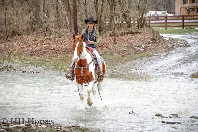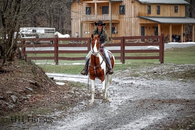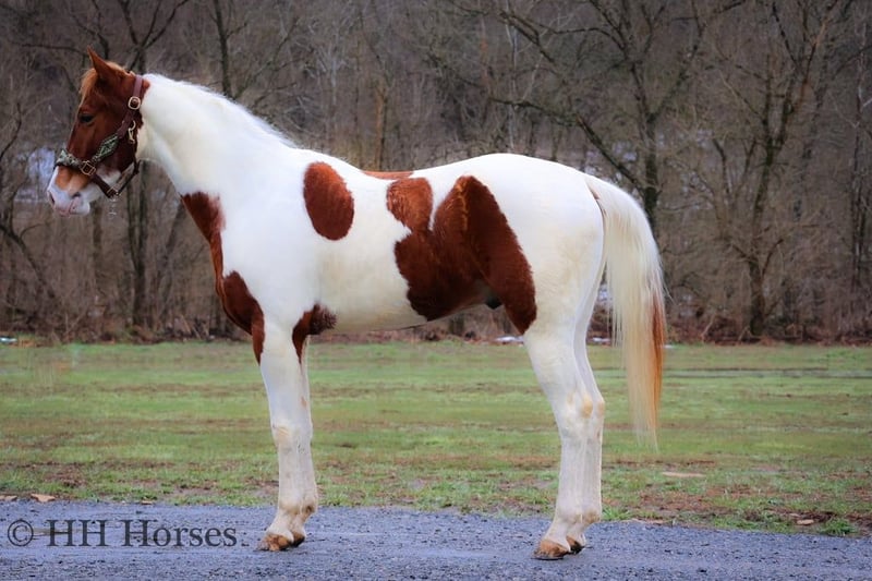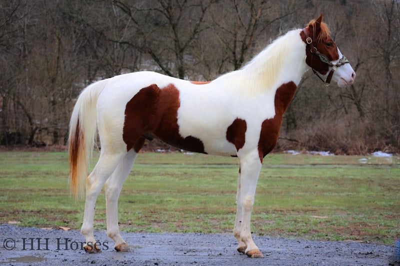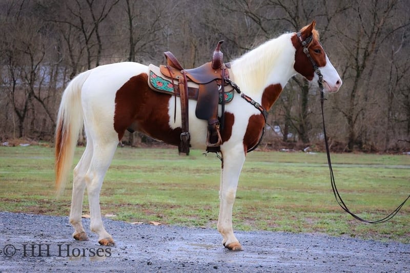 ONLINE AUCTION Place your bids at www.PlatinumEquineAuction.com Starting Bid $3500 Auction ends February 16th, 2025 Need a new saddle? Check out White Rock Saddles on our website or Facebook! This is “MACARONI”, a big 16 hand SORREL & WHITE TOBIANO PAINT GELDING that is 4 years old. This nice young gelding has been on the trails and ridden in the arena English and Western. He has been out in the woods, through the water, and up and down the rocky embankments. He is a smart, big, young horse with lots of natural ability and sense. He would excel in any performance discipline and he is well on his way to be a great trail mount. He goes out alone, been on the main roads, and has a nice way of traveling. He aims to please and will ride in the snow, ice, and mud without an issue. He bathes, hauls, stands tied, and loads ONLINE AUCTION Place your bids at www.PlatinumEquineAuction.com Starting Bid $3500 Auction ends February 16th, 2025 Need a new saddle? Check out White Rock Saddles on our website or Facebook! with no fuss. Located in Flemingsburg, KY. Contact HH Horses Erin 304-238-4155.