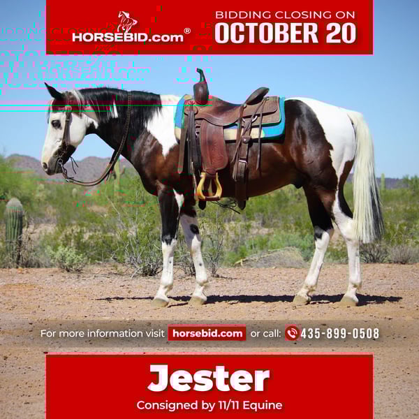 ♦️ 𝐭𝐡𝐞 𝐀𝐌𝐄𝐑𝐈𝐂𝐀𝐍 𝓕𝓪𝓵𝓵 𝓒𝓵𝓪𝓼𝓼𝓲𝓬 ♦️ Happening now thru MONDAY | OCTOBER 20th - Available EXCLUSIVELY on HorseBid's website! For more details and to register visit: www.Horsebid.com CONSIGNOR CONTACT: 11/11 Equine 435-899-0508 LOCATION: Marana, AZ BREED: Paint REGISTERED: No COLOR: Paint HEIGHT: 14.2 AGE: 6 GENDER: Gelding You’ll never find another horse like Jester! This 6 year old grade paint gelding is as unique and pretty as they come with an unusual bald face and two blue eyes. He stands a stout 14.2 hands tall and turns heads everywhere he goes. Jester is the type of horse that wants to be your best friend. He will run over to the gate when he sees you coming with a halter, loves scratches and cuddles, and wants to be in your pocket. He is gentle and kind, and fun to ride. Jester has been started roping the dummy on the heel side and is showing lots of promise there. He would also make a fantastic breakaway prospect. He has a smooth, rhythmic lope, comfortable trot, and walks quietly on a loose rein. He is responsive and has a motor when asked for it, but will only go the speed asked of him. Jester is not a spooky guy and he has done all the trail course obstacles with ease as well. He is willing and brave enough to go over and through anything you ask him to! He not only rides nicely, but he has wonderful ground manners too. He stands tied quietly, tacks up quietly, and self loads into the trailer even! Jester requires no maintenance, is currently shod on all four and is good for the farrier and vet. He will come with a current coggins and health certificate, and I am happy to help arrange hauling anywhere as well! Please feel free to call/text Claire at 435-899-0508 with any questions at all!