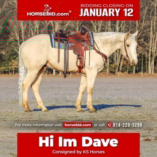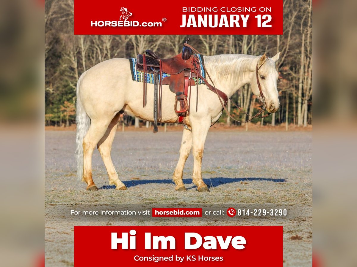 ♦️𝐍𝐄𝐖 𝐘𝐄𝐀𝐑'𝐒 𝑬𝒙𝒕𝒓𝒂𝒗𝒂𝒈𝒂𝒏𝒛𝒂♦️ Happening now thru MONDAY | JANUARY 12th - Available EXCLUSIVELY on HorseBid's website! For more details and to register visit: www.Horsebid.com CONSIGNOR CONTACT: KS Horses 814-229-3290 LOCATION: Clarion, PA BREED: APHA REGISTERED: Yes REGISTERED NAME: Hi Im Dave COLOR: Palomino HEIGHT: 15 AGE: 6 GENDER: Gelding Registered Name is Hi I'm Dave but around the barn we just call him Dave. Dave is a Beautiful 6-Year-Old Registered Palomino Gelding. Dave is the complete package of really good broke to ride and also super safe and super quiet and gentle to ride. He has had professional training when younger and has had some reining training. He rides great in the arena and has a nice head set and smooth canter and nice collected lope. Lopes circles each way hitting his correct leads. One hand neck rein and will ride off leg pressure if asked and have a nice turn around each way. My favorite thing about him is how quiet and gentle and safe he is. He would make a great family trail horse . He loves to trail ride and is a great trail horse. Goes where ever you point him on the trail. thru the mud and across the creeks with ease. He is very seasoned and sure footed in the rough terrain. Dave is very good when it comes to working with cattle and has been used as a turn back horse at the cuttings. He can perform any job you ask him to on the ranch. Dave is the whole complete package and can do in any direction but main thing is he is super quiet and gentle and safe for us. He has great bloodlines and his sire is a own son of top sail whiz. Dave just had a recent vet check and exam on 12-29-25. We can help arrange delivery anywhere in the United States. Please Call or Text Kris at 814-229-3290. Thank You and God Bless