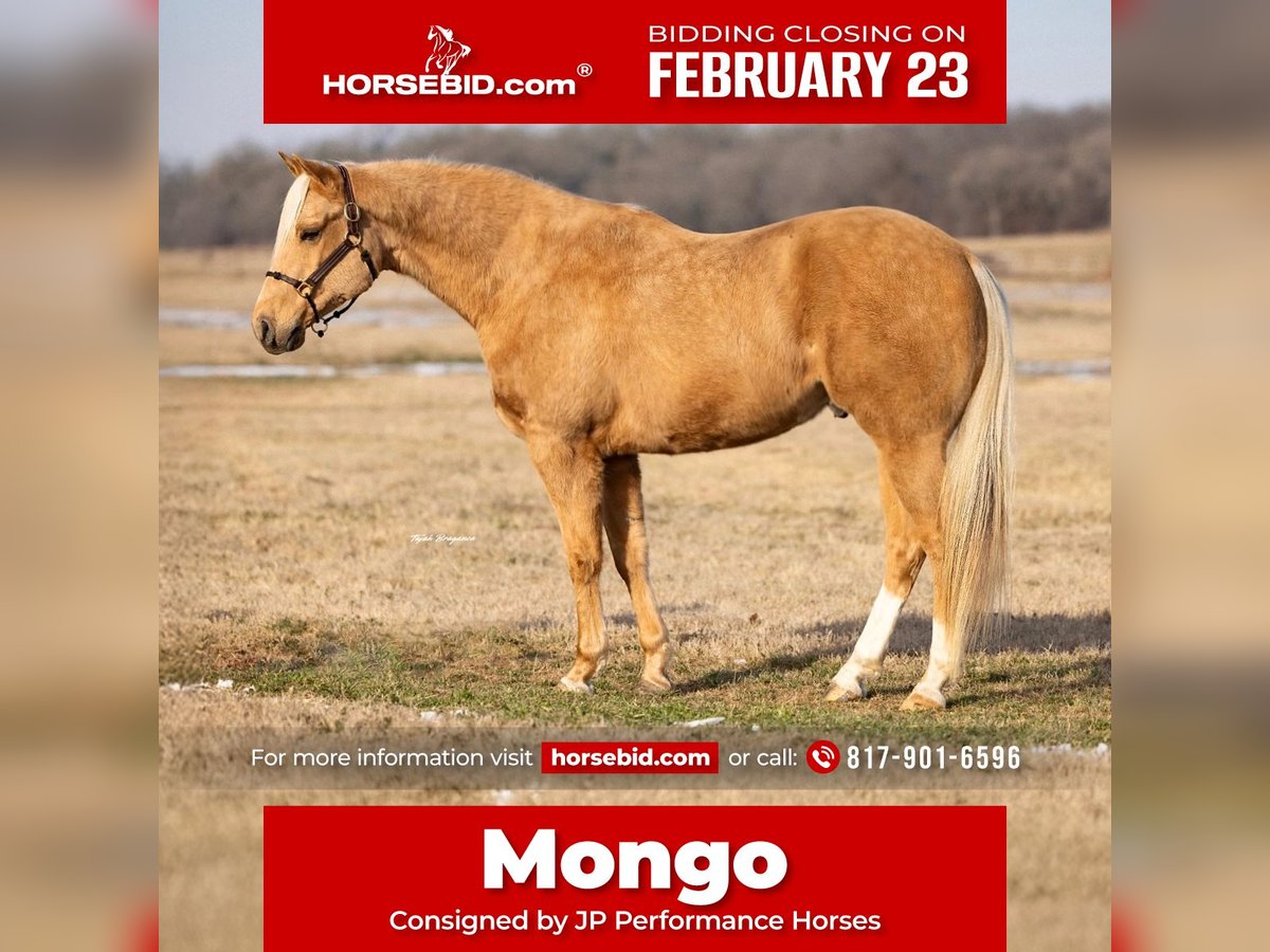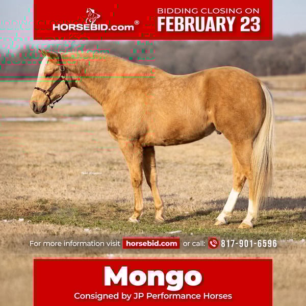 💎 𝐓𝐇𝐄 𝓓𝓲𝓪𝓶𝓸𝓷𝓭 𝐒𝐇𝐎𝐖𝐂𝐀𝐒𝐄 💎 Happening now thru MONDAY | FEBRUARY 23rd - Available EXCLUSIVELY on HorseBid's website! For more details and to register visit: www.Horsebid.com CONSIGNOR CONTACT: JP Performance Horses 817-901-6596 LOCATION: Weatherford, TX BREED: APHA REGISTERED: Yes REGISTERED NAME: The Golden Boy COLOR: Palomino HEIGHT: 15.1 AGE: 6 GENDER: Gelding Mongo is an APHA registered golden palomino standing 15.1 hands tall and absolutely the sweetest horse in our barn. His striking looks will turn heads wherever you take him. But he’s not just a pretty face— at the young age of 6, Mongo is the total package when it comes to rideability, versatility, and personality. He truly is one of those horses you can throw anyone on and trust he will take care of them. Mongo is super broke to ride and gentle every single day. Whether you're saddling him up for arena work or heading out on the trail, he’s always consistent and reliable. Mongo catches both leads with ease, has a smooth lope, a solid stop, and an incredibly comfortable slow jog. He moves off leg pressure, has a clean one-handed turnaround, and an overall soft feel. Mongo has been ridden everywhere—from trails, along highways, in the Brazos River, even through town—and he handles it all with confidence and grace. He’s sure-footed, unfazed by commotion, and has a calm, trainable mind. He is a lover. Meets you at the gate, loves bath time, wants to be your BEST FRIEND. He has all the tools to be a standout in ranch work, English and jumping, or take him to the show pen, you name it. The possibilities are endless with this talented young gelding. If you’re looking for a well-rounded horse that the whole family can enjoy for years to come, Mongo is the one. Don’t miss this exceptional opportunity! 📞 Call Jackie at JP Performance Horses at 817-901-6596 to schedule a time to meet Mongo or chat about him. 🌎 Shipping can be arranged anywhere.