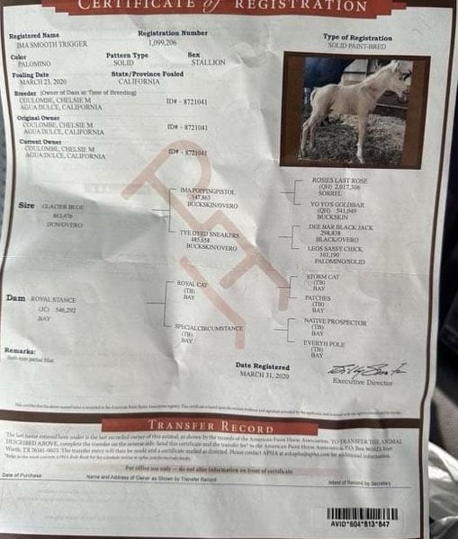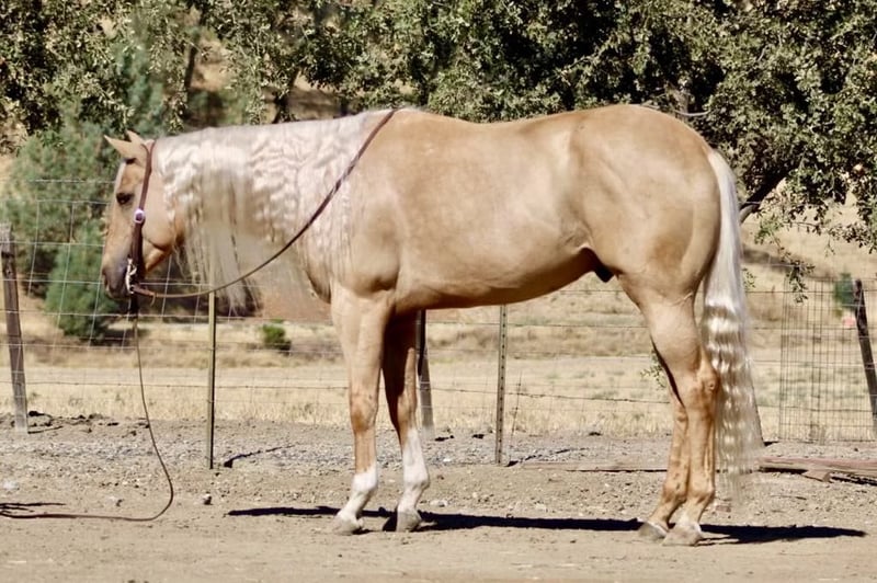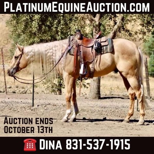 ONLINE AUCTION Place your bids at www.PlatinumEquineAuction.com Starting Bid $3500 Auction ends October 13th, 2024 Need a new saddle? Check out White Rock Saddles on our website or Facebook! Longhorn Ranch is proud to present I’m A Smooth Trigger aka Trigger , a stunning APHA 15.2 hand 2020 palomino gelding whose long, lustrous mane flows like golden silk in the breeze. If you’ve been searching for that perfect horse to complement your adventures, look no further Trigger has a gentle nature and playful personality, he’s not just easy to be around; he’s also a reliable companion whether you’re on the ranch gathering cows or navigating through diverse terrains. His smooth gaits make every ride a pleasure as he transitions effortlessly from trot to canter and back again with an elegant collected headset that speaks volumes of his training. Imagine him strutting proudly in English tack at the arena or trotting along scenic trails you’ll see heads turn wherever you go! And let’s not forget about his potential; with those graceful strides and calm disposition, who knows? He could even shine as a barrel horse if you’re feeling adventurous! Trigger adapts beautifully to any environment, making him suitable for both pasture life and stall living while handling time off like a champ. In busy traffic situations or alongside pedestrians, he remains unflappable cars and semis are nothing but passing sights to this impressive boy. So if you’re looking for that long-term partner who embodies both poise and charm in equal measure, Trigger is absolutely your man. He hauls great easy to clip tie and bath. Please contact Longhorn Ranch Dina 831-537-1915 Located in Paicines, CA. ONLINE AUCTION Place your bids at www.PlatinumEquineAuction.com Starting Bid $3500 Auction ends October 13th, 2024 Need a new saddle? Check out White Rock Saddles on our website or Facebook!