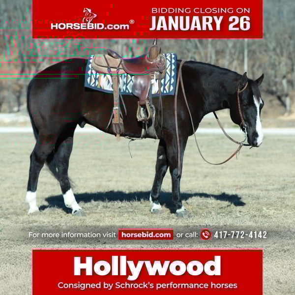 𝐉𝐀𝐍𝐔𝐀𝐑𝐘 ⭐️𝑨𝒍𝒍 𝑺𝒕𝒂𝒓 𝑳𝒊𝒏𝒆𝒖𝒑⭐️ Happening now thru MONDAY | JANUARY 26th - Available EXCLUSIVELY on HorseBid's website! For more details and to register visit: www.Horsebid.com CONSIGNOR CONTACT: Schrock’s performance horses 417-772-4142 LOCATION: Purdy, MO BREED: Apha REGISTERED: Yes REGISTERED NAME: Trade cool Ryan COLOR: Black HEIGHT: 15.2 AGE: 7 GENDER: Gelding Hollywood ❤️🔥 One word to describe this gelding? INTELLIGENT. The kind everyone looks for—he thinks before he reacts, completely adores attention, and is absolutely SAFE. Not to mention has an impressive resume’! Hollywood is a 7 year old APHA registered gelding that is sure to turn heads wherever you go! He is a pleasure to be around whether you’re in the barn or on his back. Standing 15.2h, he is a great size with lots of structure and bone. Hollywood will side pass to gates, mounting blocks or even skid steer buckets for you to mount/dismount! He is very patient and trustworthy. Under saddle he is quiet, soft, and very smooth in all his gaits. True neck rein broke, moves off leg pressure and is easy to operate. Hollywood is a super versatile gelding that truly enjoys any task. He’s been used outside on the ranch to gather, sort, and drag calves. He’s no stranger to a days work or a rugged trail and is happy to go whatever pace his rider pleases. Hollywood has also been used as a mounted search and rescue horse where he has undergone rigorous training and field experience to meet field certification requirements. Not much phases him and he is a true gentleman. In the arena, he is a great mover and stunning under English tack. He is confident and stylish over small jumps with plenty of room to improve! This gelding has an elite handle and is sufficient in his leads, circles, and speed transitions. He’s a greet-you-at-the-gate, always happy to see you type horse. Stands to be loved on, bathed, shod, etc. These type of geldings don’t come by often and we will stand behind him 100%. Hollywood will come with a clean PPE and bill of health. UTD on vaccines, coggins, worming, etc. Paperwork in hand. Please call Leroy Schrock for any questions or to schedule a visit with Hollywood! 417-772-4142