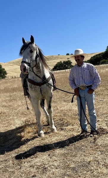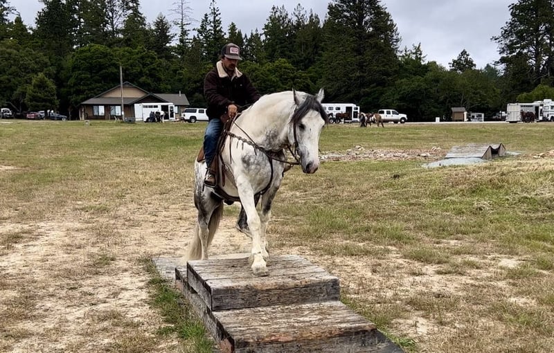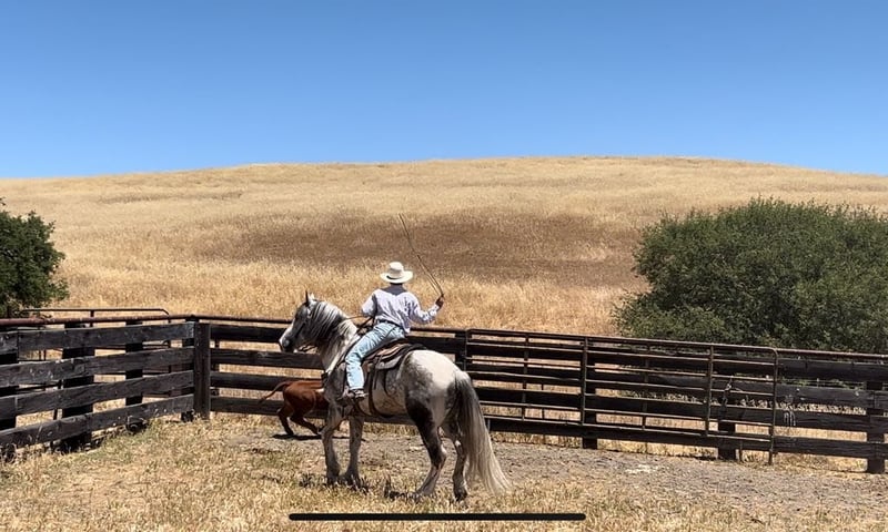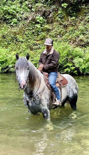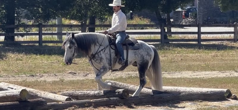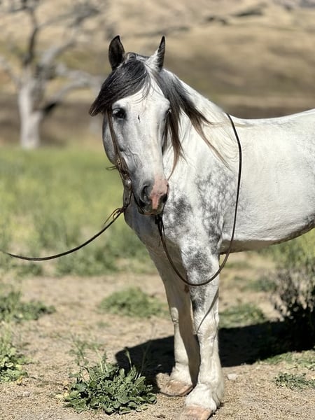 ONLINE AUCTION Place your bids at www.PlatinumEquineAuction.com Starting Bid $3500 Auction ends June 16th, 2024 Need a new saddle? Check out White Rock Saddles on our website or Facebook! Meet Koozie a 5 year old 15.2 hand dapple grey and white draft cross paint gelding. He is absolutely GORGEOUS in every way and such a good boy. He is sweet, personable, and gentle. Koozie stays quiet and easy to handle. Koozie rides western, bareback and English. He can be ridden by any rider of any level. He will walk on a loose rein all day, and move out when asked. Koozie is as comfortable as riding your lazy boy chair at every gait! He will go over small jumps in arena or fallen logs on trails. He is a trail master, will go anywhere he’s pointed. He’ll take you through the deepest water to cool off, into thick woods, or walk you right into town. He is alway on his best behavior and turns every head he passes. They don’t make them any prettier than him. Koozie has been desensitized to the flapping tarp, bouncing ball, And whipping flags! Koozie has also been used out on the ranch to gather and has doctored cattle in the pasture and been to the branding pen. This big boy travels like a horse half his size, he neck reins, collects while backing up, and uses his hind quarters when stopping. He will yield his hindquarters and responds to leg pressure. He catches both his leads effortlessly and lopes pretty perfect circles. Koozie can do rollbacks and lope right off. He has been an absolute joy to have at our ranch he will be greatly missed. Koozie cross ties, clips, bathes and is good for the farrier. He loads up easy and travels well. This gentle giant could go on to do great things. He has the soft, kind eye that makes a great horse. If you want a horse that you will fall in love with, Koozie is your man. Koozie will be the fan favorite everywhere he goes he is just stunning. Located in Paicines, CA. For more info call Longhorn Ranch Dina 831-537-1915. ONLINE AUCTION Place your bids at www.PlatinumEquineAuction.com Starting Bid $3500 Auction ends June 16th, 2024 Need a new saddle? Check out White Rock Saddles on our website or Facebook!