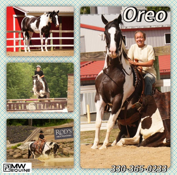 🍂 𝓐𝓾𝓽𝓾𝓶𝓷 𝑨𝑳𝑳 𝑺𝑻𝑨𝑹 𝑳𝑰𝑵𝑬𝑼𝑷 🍂 Happening now thru MONDAY | OCTOBER 6th - Available EXCLUSIVELY on HorseBid's website! For more details and to register visit: www.Horsebid.com CONSIGNOR CONTACT: MW Equine Stables LLC 330-365-0233 LOCATION: Fresno, OH BREED: Paint REGISTERED: No COLOR: Black & White HEIGHT: 15.1 AGE: 7 GENDER: Gelding 💥Oreo is a 7 yr old paint gelding that with the best color and conformation ever.. This guy stands 15.1 HH and is an absolute Sweetheart.. Super Versatile, Rides English,Western, amazing trail horse.. and could excell as an amazing Hunter Jumper.. Oreo is the perfect babysitter for the whole family. Whether it’s the grandkids or beginner riders, he’s the one you can trust. In the barn, Oreo is as sweet and gentle as they come. He’s quiet to handle, stands nicely for grooming, and gets along with all the farm life — dogs, kids, you name it. Under saddle, he’s dependable and uncomplicated, safe for any level of rider. He’s trail-savvy, willingly crossing logs, creeks, ditches, and navigating any obstacle without hesitation. He will walk, trot, and canter effortless circles, but his happy place is strolling steadily down the trail, carrying his rider with confidence and care. Well-build, beautifully marked, and flashy, Oreo turns heads wherever he goes. He’s clean, sound, and vice-free, plus easy to shoe, load, and haul. If you’re looking for a fun, willing, and trustworthy gelding who’s as pretty as he is kind, Oreo is ready to be your family’s favorite. ☎️ Contact Marcus for more info 330-365-0233