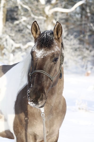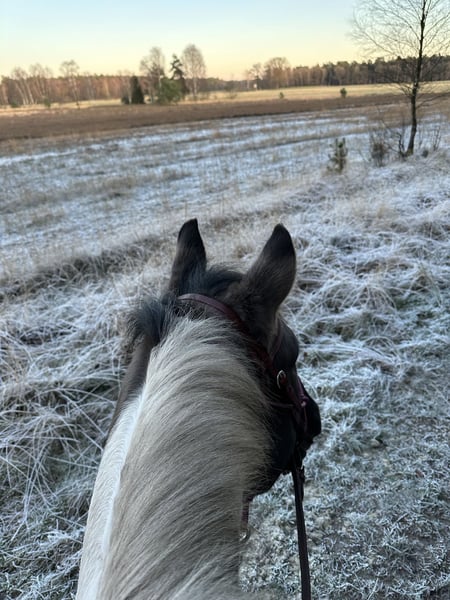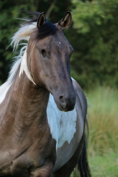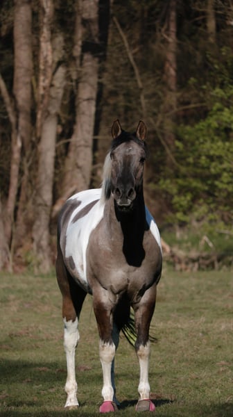 For sale is an 8-year-old Paint Horse gelding in the rare and stunning Grullo color. He is correctly built, exudes a lot of expression, and has a strong presence – a horse that cannot be overlooked. He has been in our possession for seven years and has lived both in a large herd on extensive pasture land and currently in box stall confinement with a small gelding herd. He tends to be more dominant and confident in social interactions. Due to periodic conjunctivitis, both eyes were operated on when he was three years old; unfortunately, he lost one eye due to an infection post-surgery. However, this does not limit him in everyday life – he copes very well and has been specifically verbally trained on his "blind side" (right). He was only backed at the age of six. He initially handled this well: walk, trot, and canter, including tempo regulation, were no problem. However, during further training, it quickly became clear that this is not his preferred lifestyle. He has a true fighter's heart in all disciplines, and if he doesn’t want to do something, he clearly questions it – therefore, he is explicitly not being sold as a riding horse, as he currently does not enjoy endless rounds in the arena. His strengths lie clearly in groundwork, trail riding, as well as in trail and mental exercises. He is extremely intelligent, learns complex routines very quickly, and works happily with a handler who approaches him correctly. Character-wise, he is not a "cuddle horse" – he tests boundaries, immediately exploits uncertainties, and consistently challenges his handler. At the same time, he is incredibly sensitive and refined, offering his person very special moments when led with clear, fair guidance. He is a brave horse that requires an experienced, confident horseman with excellent timing, who enjoys working with a strong-willed horse and guiding it with love and consistency. He is not suitable for beginners or insecure riders. Of course, he has been examined by a veterinarian – physically, he is in absolute top condition. We are reluctantly offering him for sale because we have realized that we ask things of him that he cannot give, and he offers us things that, unfortunately, are not enough for us. Therefore, we are looking for a wonderful, five-star forever home where he will be seen, appreciated, and loved. If genuinely interested, we look forward to receiving a message with a brief introduction.