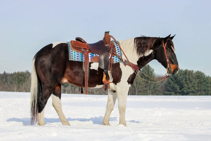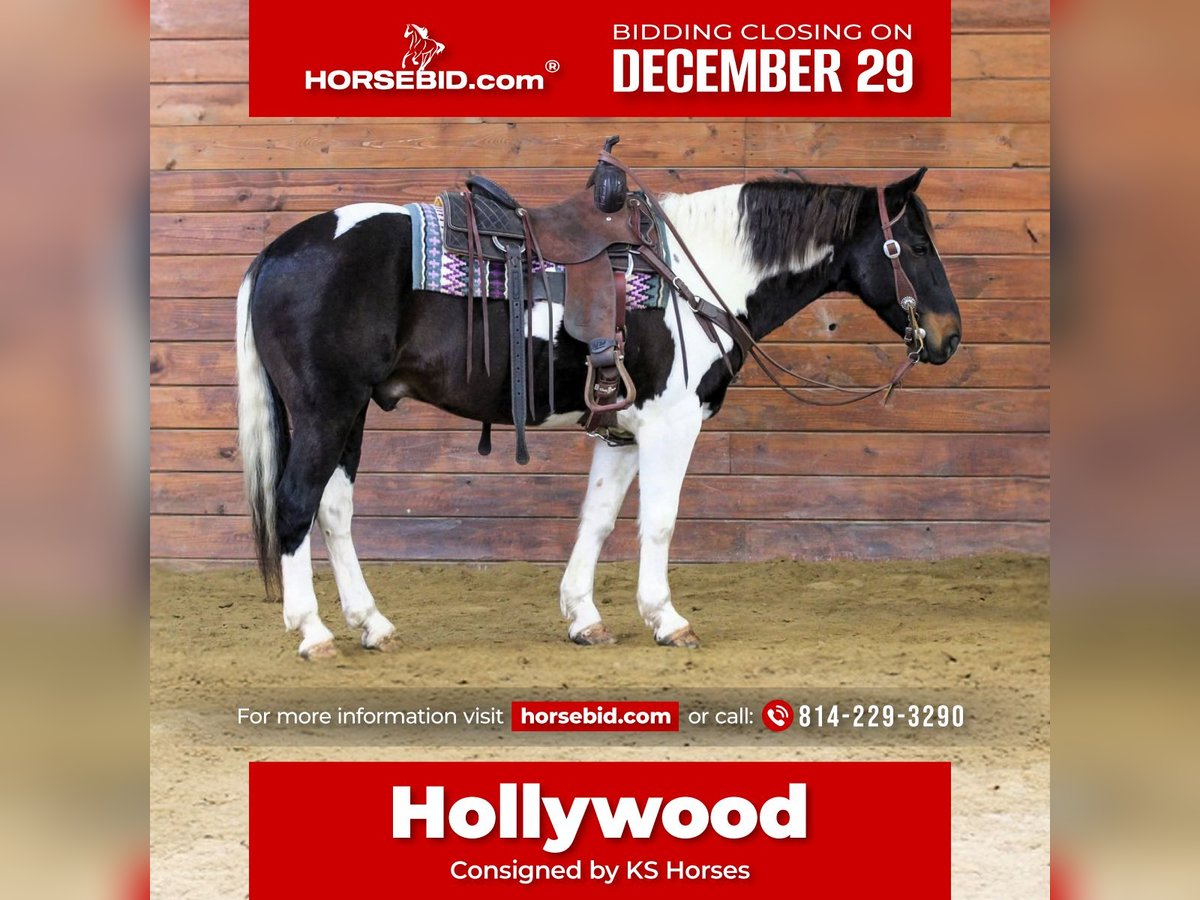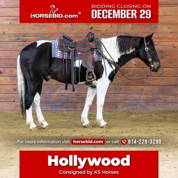 ⚜️ 𝓗𝓮𝓻𝓲𝓽𝓪𝓰𝓮 𝐖𝐢𝐧𝐭𝐞𝐫 𝓒𝓵𝓪𝓼𝓼𝓲𝓬⚜️ Happening now thru MONDAY | DECEMBER 29th - Available EXCLUSIVELY on HorseBid's website! For more details and to register visit: www.Horsebid.com CONSIGNOR CONTACT: KS Horses 814-229-3290 LOCATION: Clarion, PA BREED: Paint REGISTERED: No COLOR: Black and White Paint HEIGHT: 14.3 AGE: 8 GENDER: Gelding Hollywood is a 8 Year Old Good Looking Fancy Paint Gelding. Standing 14.3 hands tall and super thick and stocky built. He is a nice size making him easy to mount or dismount but also is stocky enough to carry any size rider. Hollywood is the kind of horse that everyone wants and needs but also the kind of horse that is very hard to find. He is a great trail horse. Goes anywhere you ask him to go on the trail . Has been on many miles of trails. Trail rides with other horses or by himself. Hollywood is good with the tarp, big ball and even crack the bull whip off him. He has been ridden down the road and is traffic safe. Hollywood has one of the nicest smoothest lopes, and picks up his correct lead each time in the arena making him a good candidate for a lesson horse. He has also been used to move cattle around on the farm . Super friendly and easy to catch. Loves attention. Good for the vet, farrier and easy to bath. Not complicated at all to ride. Super easy get on and point and go! Dont miss out on this super nice all around gelding . We can help arrange shipping anywhere in the United States. Call or Text Kris at 814-229-3290. Thank You and God Bless