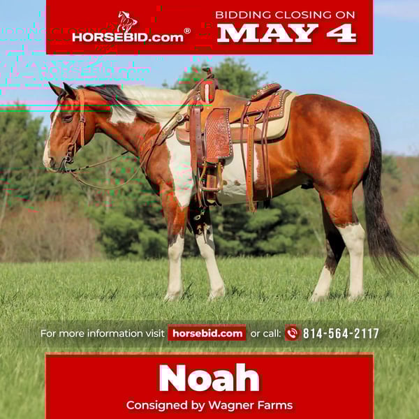▪️▫️◾️𝐭𝐡𝐞 𝑴𝒂𝒚 𝐒𝐞𝐥𝐞𝐜𝐭◾️▫️▪️ Happening now thru MONDAY | MAY 4th - Available EXCLUSIVELY on HorseBid's website! For more details and to register visit: www.Horsebid.com CONSIGNOR CONTACT: Wagner Farms 814-564-2117 LOCATION: Clarion , Pa BREED: Paint REGISTERED: No REGISTERED NAME: Noah COLOR: Bay and White Paint HEIGHT: 15 AGE: 9 GENDER: Gelding Noah is a 9 Year Old Flashy Bay and White Paint Gelding. Standing 15 hands tall and Stocky Built. Noah is a Great Trail Horse. He is the definition of trail horse deluxe! Water , mud , logs it doesnt matter he will go thru and over it all with ease and never hesitate. Very seasoned and reliable trail mount. Spring is here ! Noah is ready to be your trail buddy this Summer! We have ridden him on the main highways and in thru town. He is traffic safe and good in hectic environments. He also rides very nicely in the arena and is a good mover and has a good head set and nice walk, trot and canter. Has been ridden English and can take a jump. He would also make a good ranch horse also. He is in the prime of his age at the perfect age of 9 but still has his whole life ahead of him. He doesn't need ridden every day to stay good broke. You can give him time off and he still rides good. Friendly and loves attention. Good for the farrier and vet. Excellent ground manners. Who ever is the lucky winner of Noah is gonna absolutely love him. We can help arrange delivery anywhere in the United States. Call or Text Glory at Wagner Farms at 814-564-2117 . Thank You and God Bless
