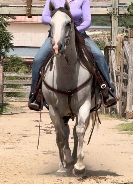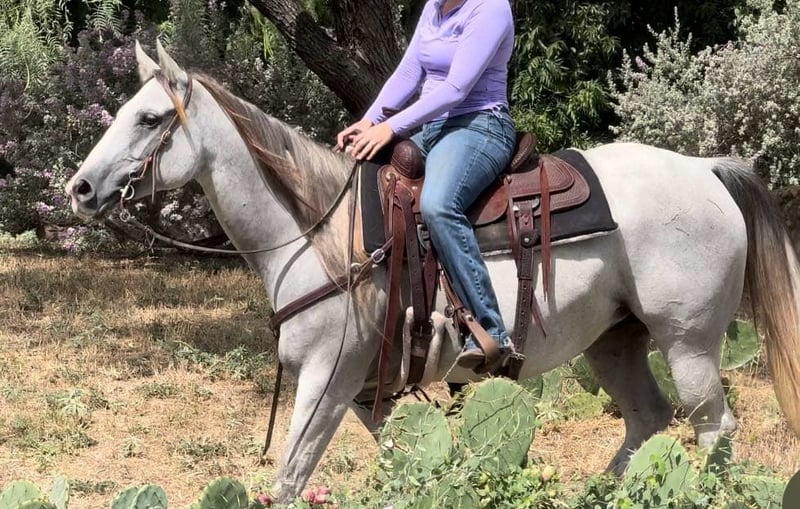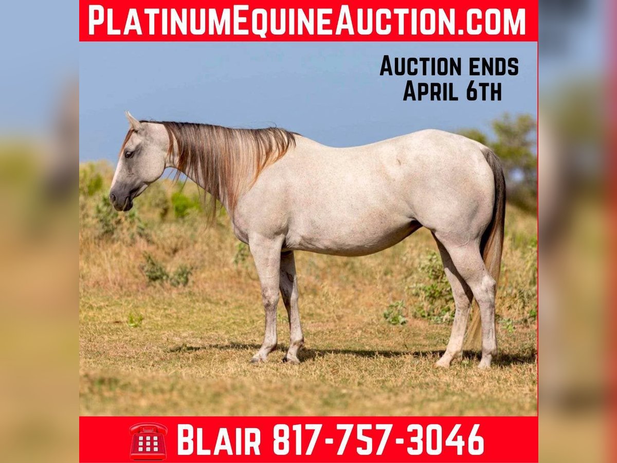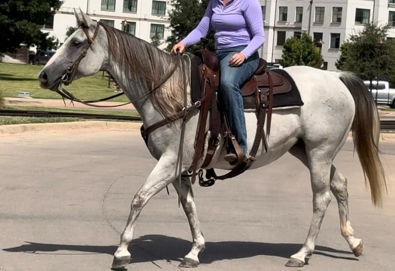 ONLINE AUCTION Place your bids at www.PlatinumEquineAuction.com Starting Bid $3500 Auction ends April 6th, 2025 Need a new saddle? Check out White Rock Saddles on our website or Facebook! Abby is a 9 yr old 14.2H, gorgeous, stout gray QH mare. She is a laid back trail rider’s dream! If you’re looking for one that’s more whoa than go, and extremely gentle natured, don’t miss this girl! Abby has been used as a family trail horse, where mainly the 11 yr old novice rider used her. She’s been rode in town and on trails primarily. She is not spooky in the slightest and is very laid back. She is one of those horses you can haul alone without her going crazy in the trailer or while tied looking for a friend. She stands solid footed wherever you tie her and bathes like a statue. She would be the perfect first horse for the little girl who wanted to crawl all over/under her, braid her hair and call her sprinkles. She’ll stand all day without a fuss and is absolute safe safe safe on the ground to be around the littles. Abby is a brick house and she’ll be able to handle most any size rider! Under saddle, she is very much a more whoa than go kind of gal. While you can absolutely get her to switch gaits, she won’t be one that trots/runs off with you ever! She stands solid as a rock to mount and NEVER will take a step until asked. She goes through water, over railroads and by cars without an issues. In the car world, she’s your Honda Civic, trusty and reliable but not going to win the Daytona 500. Abby is absolutely gentle all the way around and if you can walk a friendly dog, you’ll absolutely be comfortable with this mare. She’s also a comfortable horse to ride at all gaits. She’s best at direct reining but definitely will neck rein with leg pressure. Abby always stops exactly when you ask her to no matter how fast you’re going. She has one of the best, most laid back, gelding like personalities we’ve ever seen with a mare. She gets along with all other horses well and is a zero drama mare. She would excel as a trail horse, lesson horse for baby beginners, first kid horse, or first horse for a timid rider/horseman. She’s an incredibly easy keeper and stays fat on air. Abby is UTD on teeth and feed and is ready to go be her new person’s giant, respectful, quiet, easy going, melodramatic partner! Go to her website page northtexashorsecompany.com/abby for more pictures and footage! Please call Blair with North Texas Horse Company for more info at 817-757-3046. We are located in Weatherford, TX and can help arrange affordable shipping to anyone!! ONLINE AUCTION Place your bids at www.PlatinumEquineAuction.com Starting Bid $3500 Auction ends April 6th, 2025 Need a new saddle? Check out White Rock Saddles on our website or Facebook!