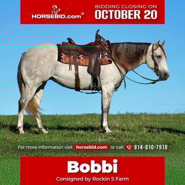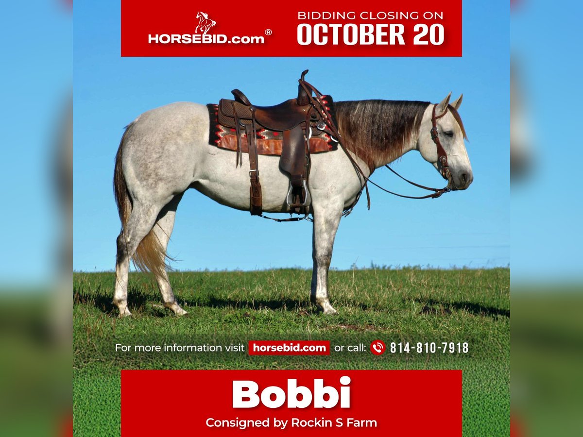 ♦️ 𝐭𝐡𝐞 𝐀𝐌𝐄𝐑𝐈𝐂𝐀𝐍 𝓕𝓪𝓵𝓵 𝓒𝓵𝓪𝓼𝓼𝓲𝓬 ♦️ Happening now thru MONDAY | OCTOBER 20th - Available EXCLUSIVELY on HorseBid's website! For more details and to register visit: www.Horsebid.com CONSIGNOR CONTACT: Rockin S Farm 814-810-7918 LOCATION: Rebersburg PA BREED: Quarter horse REGISTERED: Yes REGISTERED NAME: Bobbi COLOR: Gray HEIGHT: 15 AGE: 9 GENDER: Mare 🌟🌟Bobbi 🌟🌟 Wow! Here's a gorgeous registered AQHA quarter horse mare that is a tank, she is well built and stands 15 hands tall, Bobbi is also very well broke and gentle, we think most anyone can get along with her ,She carries her head around to the ground and will never get her head above the saddle horn. You can ride her double, stand up on her, do backflips off of her, throw balls and tarps all over her, ride her bridle-less and SO much more. She stands for baths, to be saddled, brushed, tied, mounted and anything you ask of her. She has helped us rope ponies and we've ponied Colts off her, she never gets excited and handles any job you ask of her well. Bobbi has been ridden in parades where there were sirens, fire trucks, motorcycles, atvs, loud crowds and SO much more. She will walk, trot, and lope off with ease, with no buck, kick, rear or bite, Bobbi is the first to you in the pasture, and loves people. She will cross logs, ditches, creeks, bridges, tarps, and any obstacles you ask of her. She is 100% sound She has even been in the DRIVE THRU in town, and ridden down 4 lanes of traffic! Bobbi works off of leg pressure, and will get down on a cow as well! She truly loves to work. If you are any bit worried about buying a horse, and not loving it when you get home, you won’t have to worry about this one. She is NOT a traded around horse and will take you anywhere you would like to be. If you wanna take one home your kids can ride on the weekend, and you can use during the week, look no further. Bobbi will NOT disappoint you when you get her home. Bobbi sells 100% sound and requires no maintenance, she is up-to-date on farrier and dewormer and has a current coggins and health certificate If you’re looking for a pretty gray registered AQHA quarter horse mare be sure to check her out We are happy to assist in arranging transportation anywhere in the US If you have any questions please feel free to call us 814-810-7918