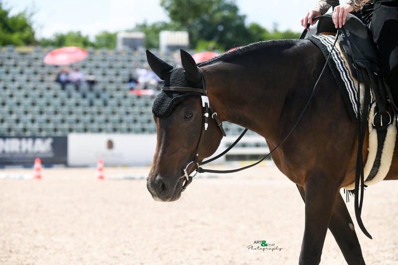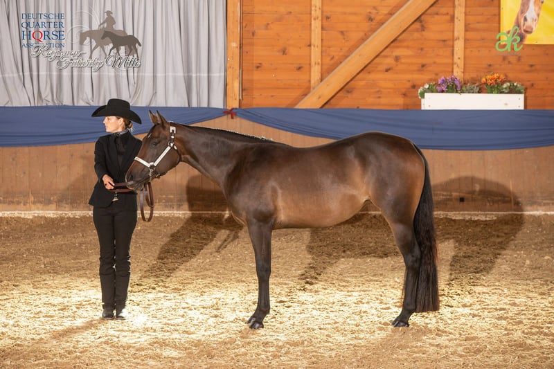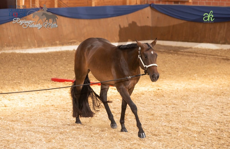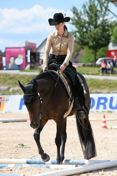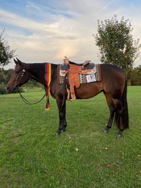 Seltene Gelegenheit für Amateur-, Youth- und Open-Reiter „On MY Beat“ aka Velvet, 03/2016, 154 cm Stockmaß, von BLAZE EM ON aus einer direkten ONE HOT KRYMSUN Tochter wegen Aufgabe des Reitsports zu verkaufen. Velvet ist eine sehr schicke, korrekt gebaute Stute, mit herausragenden Bewegungen und viel Talent für den Western Allround-Reitsport. 2018 von Züchterin Dunja Klein gekauft und seitdem liebevoll und schonend ausgebildet. 2021-2023 Training und Showing bei RB Showhorses (Rikke Benjaminsen). Velvet zeichnet sich durch absolute Zuverlässigkeit und Coolnes aus. Ihre stärkste Disziplin ist der Trail. In der Western Pleassure überzeugt sie durch einen wunderbar gesetzten Lope und Jog. Weitere Disziplinen: Showmanship at Halter, Horsemanship und Hunter under Saddle. Bei entsprechender Förderung sehen wir sie auch in der Westernriding. Neben ihren Showerfahrungen ist Velvet ein Allround-Pferd im besten Sinne. Sie hat einen tollen Charakter und ist eine Top-Partnerin für Familie und Freizeit. Sie steht tagsüber in einer Stuten-Gruppe und ist sehr verträglich mit anderen Pferden. Im Gelände ist sie immer ausgeglichen und freudig in allen Gangarten unterwegs, allein oder in der Gruppe, auch mit Sidepull gezäumt. Velvet kennt es ein Handpferd an ihrer Seite zu haben. Aktuell geht sie mit Hund beifuß. Velvet wird mit komplettem Equipment verkauft: Blue Ribbon Roghout Saddle grau mit Verzierung, passendes Kopfstück von California Ranch, Show-Halter von Kathy’s und vieles mehr. GESUNDHEIT 7-Penal-Test N/N Untersuchungsergebnis Laboklin liegt vor. Insbesondere als Jungpferd regelmäßig chiropraktisch bzw. durch Physio gecheckt. Sie ist regelmäßig entwurmt und geimpft. Letzte Zahnkontrolle war 2024. Aktuell trägt Velvet Eisen. Sie kann aber auch barfuß gehen. Gerne kann eine Ankaufsuntersuchung bei Kostenenübernahme durch den Käufer bei uns im Stall gemacht werden. Röntgenbilder sind noch keine vorhanden. ERFOLGE 2018 DQHA Regionen Futurity Mitte – Res. Futurity Champion Trail in Hand 2 yo 2018 DQHA Regionen Futurity Mitte – 3. Platz Futurity Longe Line 2yo 2018 DQHA Regionen Futurity Mitte – 3. PLatz Futurity Halter 2yo Mares 2018 DQHA Regionen Futurity Mitte – 2. Platz Amateur L1 Halter 2 & Under Mares Show 1 2018 DQHA Regionen Futurity Mitte – 4. Platz Amateur L1 Halter 2 & Under Mares Show 2 - CORONA PAUSE - 2022 EWU Doppelshow Kreuth 2022 – 2. Platz Jungpferde Basis 6jährige Pferde 2022 EWU German Open – 3. Platz Bronce Medaille Jungpferde Trail 6jährige Pferde 2022 EWU German Open – 11. Platz Jungpferde Basis 6jährige Pferde 2022 Bavarian Summer Show – Grand Champion Mares Three and Over Amateur / Show 3 2023 VWB Bavarian Championship – L1 Trail - 8. / 8. / 12. Out of 43 entries ABSTAMMUNG: Sire: BLAZE EM ON (BLAZIN HOT X REGAL ASSET) Dam: ONE HOT MS (ONE HOT KRYMSUN) Züchterin: Dunja Klein, Deutschland. Wir wünschen uns für Velvet ein liebevolles 5☆ Zuhause, in dem sie weiter gefördert wird und der absolute Mittelpunkt sein darf. STANDORT: 76571 Gaggenau (Deutschland) Nähere Informationen und Bilder gerne auf Anfrage. +49 172 8815209 PM oder WhatsApp