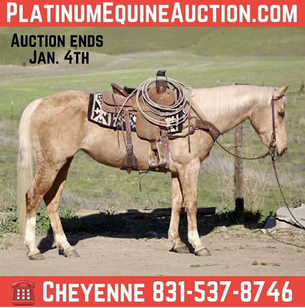 ONLINE AUCTION Place your bids at www.PlatinumEquineAuction.com Starting Bid $3500 Auction ends January 4th, 2025 Need a new saddle? Check out White Rock Saddles on our website or Facebook Cadi is a gorgeous 14.3HH palomino mare who is 12 years old and right in the prime of her life, with many great years ahead of her. She is the kind of horse that truly fits into any program and excels as a safe, dependable family mount. Cadi has been ridden by all ages and experience levels and is a horse you can genuinely trust. She has zero spook and no funny business, making her a confidence booster for beginner riders while still being responsive and enjoyable for more experienced riders. She is extremely well traveled and comfortable in a variety of environments, including high-paced roads, long and tricky trails, and everything in between. Cadi is honest and reliable, and she handles time off exceptionally well—you can pull her out after weeks or even longer and ride with confidence. She neck reins with a light touch, is very responsive to cues, and always tries to please her rider. In the arena, Cadi knows both leads, goes around nicely, collects at the poll, and has a smooth, light backup. She has pushed cows and has been exposed to many different farm animals, taking everything in stride. She has enough go to keep up with a group all day when asked, yet is relaxed and happy to slow down for an easy ride or head out alone. Cadi offers the perfect balance of forward and calm, making her suitable for multiple disciplines and riding styles. She is located in Bitterwater, CA. For more info contact Cheyenne at 831-537-8746. ONLINE AUCTION Place your bids at www.PlatinumEquineAuction.com Starting Bid $3500 Auction ends January 4th, 2025 Need a new saddle? Check out White Rock Saddles on our website or Facebook