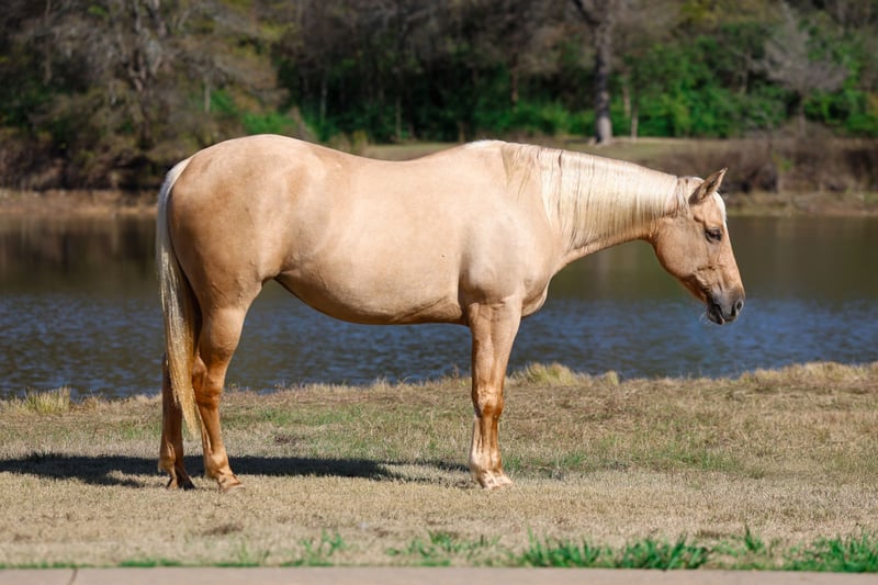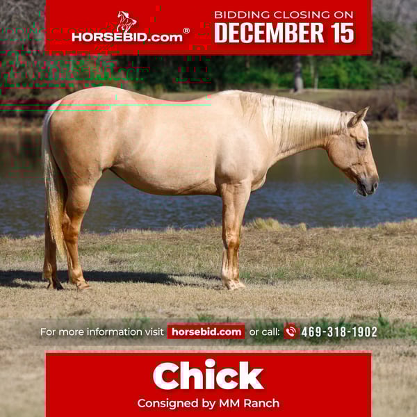 🎄𝐓𝐇𝐄 𝑯𝒐𝒍𝒊𝒅𝒂𝒚 𝐂𝐋𝐀𝐒𝐒𝐈𝐂🎄 Happening now thru MONDAY | DECEMBER 15th - Available EXCLUSIVELY on HorseBid's website! For more details and to register visit: www.Horsebid.com CONSIGNOR CONTACT: MM Ranch 469-318-1902 LOCATION: Forney, TX BREED: AQHA REGISTERED: Yes REGISTERED NAME: POCO UNO DOCS TWO COLOR: Palomino HEIGHT: 15.2 AGE: 10 GENDER: Mare 📝Meet Chick. Her registered name is “POCO UNO DOCS TWO”. She is just 10 yrs old. Fancy mare that rides like a finished reining horse!! She can spin a hole in the ground. Then from a stand still step into the prettiest western pleasure short lope. She is a blast to ride. 🪩This girl is as classy and stunning as they make them. She has all the fancy bells and whistles. Plus she is a bombproof all around type anyone can ride. Stands 15.2 hands tall. She is a stout, thick, wide made girl. She is a gorgeous palomino with a line down her back. (So if not mistaken that makes her carry a dun gene.) 🔎Chick has an old soul, been-there-done-that personality that makes her the go-to for a quiet enjoyable ride. She is both well trained and well behaved in any scenario or discipline. She is quiet and soft to ride in or out of the arena, alone or in a group. Not at all skittish, jumpy or reactive yet sure-footed and nimble through coarse uneven terrain. Has a ground covering walk, a silky smooth jog, and a dreamy lope all on a loose rein or even no bridle at all! Not forward or pushy making her a terrific step up for a novice rider looking for a confidence builder or babysitter to show them the ropes! Very forgiving and patient both on the ground and under saddle. She rides English as well and has been schooled over cross rails up to 2ft. She ready to go show with endless potential to progress. Has enough of a handle to participate in shows. English or western. She would make an excellent amateur cutting or team sorter. Has all the training there. 🕰️Chick has spent plenty of late nights around the roping pen as well as early mornings trotting out to move cattle. She is no stranger to a hard days work and is a blast to use! Side passes to open and close gates, rides anywhere in the group, has snubbed colts, drug logs, crosses water, easy to catch wherever you find her, loads and hauls like a dream, stands tied quietly, great for the farrier. ❤️Chick is absolutely a favorite among everyone that meets her. I can not express enough how safe she truly is. This mare wants to please and wants to take care of her rider. She has zero and I men zero bad habits. You will not get hurt around this mare. Unless you are just drunk and fall off. 👍🏼She is such an easy keeper. No maintenance or special things for her. No warming her up before you get on to ride either. You can get on her fresh out on the pen and go. She is not silly or high strung. She is truly a once in a lifetime type horse. 🥰Chick has been at the same place her whole life. She has only had 2 homes including us. The elderly man that bred and raised her sold her to us after he fell very ill. He put so much time and training into this mare. We would love to find her an amazing home. And would love updates to pass on to him. We know all of her history so feel free to ask. 💯She is 100% sound in every way. Even sound to bred if you want to do that. We will stand behind this mare. She is a good one. 🌎We can help with making shipping arrangements. We will help make this a very easy process to buy and get her to you. Feel free to call with any questions about her.