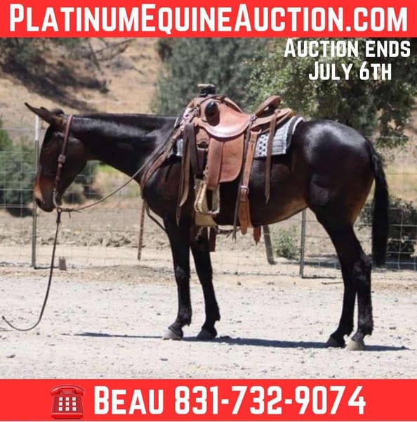 ONLINE AUCTION Place your bids at www.PlatinumEquineAuction.com Starting Bid $3500 Auction ends July 6 2025 Need a new saddle? Check out White Rock Saddles on our website or Facebook! Are you looking for a sweet and reliable riding companion? Look no further than Bella, the 11-year-old Molly mule with a heart of gold. At 15 hands, Bella is the perfect size for any rider. She’s been trained to gather and check fences, making her a surefooted and capable partner on any trail. But Bella isn’t just about work – she’s also a joy to be around. Catching and saddling her up is a breeze, and she’s always eager to please. Bella has also been trained over obstacles, making her a pro at walking over tarps and tires. And with her experience riding downtown, she’s comfortable around traffic and cars. In the arena, Bella is a dream to ride and has all the basics down. She’s even great with more sensitive tasks, like clipping and having her ears handled. If you’re in search of a first mule or simply a safe and reliable riding partner, Bella is the one. Contact Beau Mendala 831-732-9074 to come meet this great companion located in King City, CA. ONLINE AUCTION Place your bids at www.PlatinumEquineAuction.com Starting Bid $3500 Auction ends July 6 2025 Need a new saddle? Check out White Rock Saddles on our website or Facebook!
