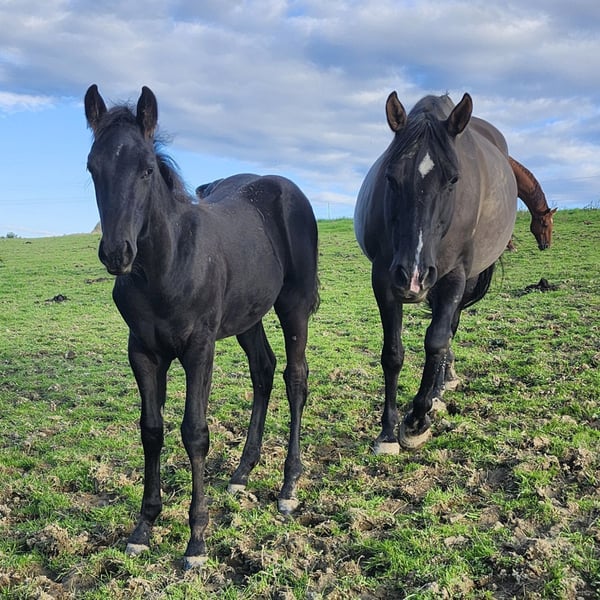 Low-spirited broodmare unsuitable for riding due to arthritis in the right hind knee caused by a pasture accident. 5-panel N/N Heterozygous black Heterozygous dun Very gentle and easy to handle Loading-friendly Currently has a colt foal by DRIFTS CHIP from the 6666 Ranch at foot. Can be sold as a package: mare with foal (€11,000) or separately. Colt foal: Drifts To The Future, born June 5, 2025, black (homozygous black and homozygous agouti). Optionally, the mare can be purchased with a breeding jump from Commander Good Bar for 2026. Further information by phone: +352-621-328144