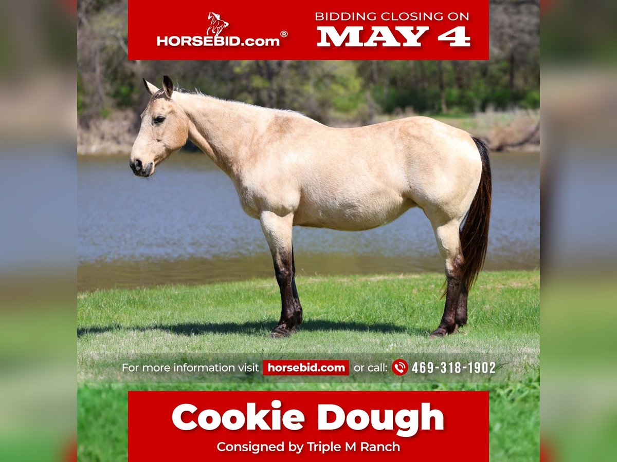 ▪️▫️◾️𝐭𝐡𝐞 𝑴𝒂𝒚 𝐒𝐞𝐥𝐞𝐜𝐭◾️▫️▪️ Happening now thru MONDAY | MAY 4th - Available EXCLUSIVELY on HorseBid's website! For more details and to register visit: www.Horsebid.com CONSIGNOR CONTACT: Triple M Ranch 469-318-1902 LOCATION: Talty, TX BREED: Quarter Horse REGISTERED: No REGISTERED NAME: Cookie Dough COLOR: Buckskin HEIGHT: 14.3 AGE: 12 GENDER: Mare 🍪Meet Cookie Dough!! A beautiful buckskin mare. 12 years old and 14.3 hands tall. She is a sweet glamorous mare that is unbelievably broke!! This mare has all the fancy bells and whistles in her training. Plus Cookie Dough is the true definition of gentle, safe, well-mannered type. Whether you’re looking for a horse for the whole family to hit the trails on, a solid broke mount to go do a days work on, or a smooth ride to play around in the arena Cookie Dough is your girl!!! She has been used around ranches her whole life, making her very experienced and versatile! She’s great if rode once a week, once a month or even once every 6 months! She doesn’t get fresh. No tune up required. She’s the kind you can just jump on and go! Cookie Dough will go absolutely anywhere you point her, through rough rocky country, steep slippery slopes, thick brush, flowing waters, busy streets of town, you name it and she will go on through it without batting an eye and she is as surefooted as can be! Cruise on down the trail with ease on her. She is not only great to ride outside, she’s an absolute blast in the arena as well! She will walk, trot, and lope both ways with ease. Smoothly picks up both her leads, neck reins perfectly, and has a good stop! Cookie Dough has been used to gather and sort cattle, and used for roping. She would excel in team penning or team shorting events. No matter what you do with her you as sure to enjoy her. 🍪Cookie Dough is a super easy keeper. Requires no maintenance of any kind. No special feed or supplements. She can go bare foot or put shoes on her. She has excellent hooves. Good with her feet/farrier. She gets along great with other horses. She is not mean to other horses or marish. You can stall her or turn her out. Doesn’t matter to her. She sells 100% sounds with no issues. She did have a pre vet evaluation done included in the pictures. If you have anymore questions about her feel free to call. We would love to visit with you about her. We can help you arrange shipping anywhere. She is up to date on all vaccinations, worming, had her teeth checked, feet. She is ready to go to her new home to be loved and enjoyed.