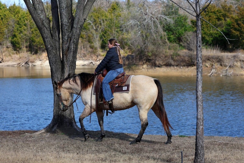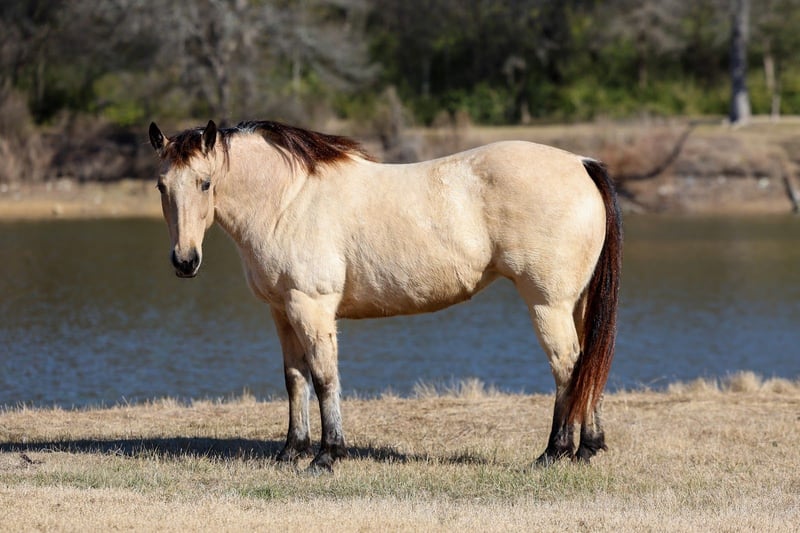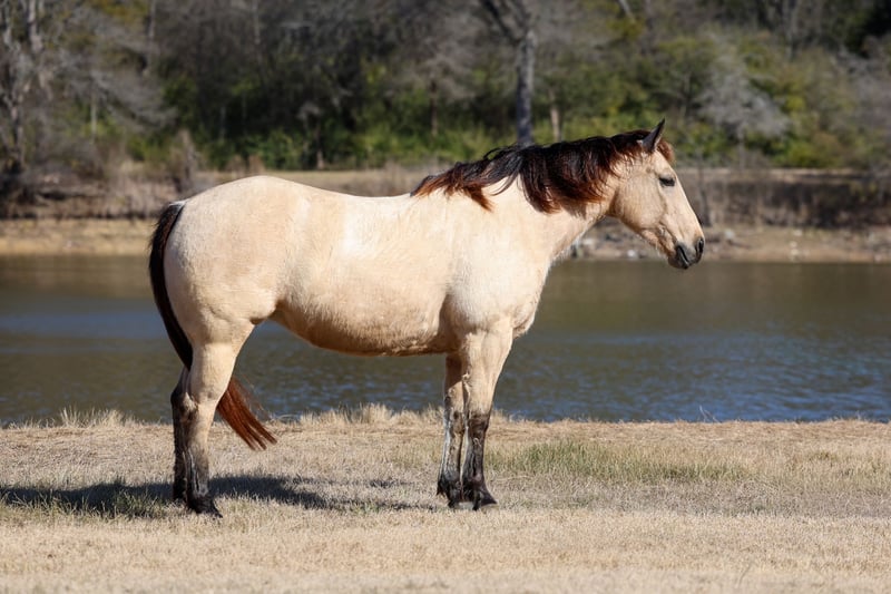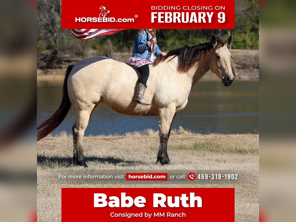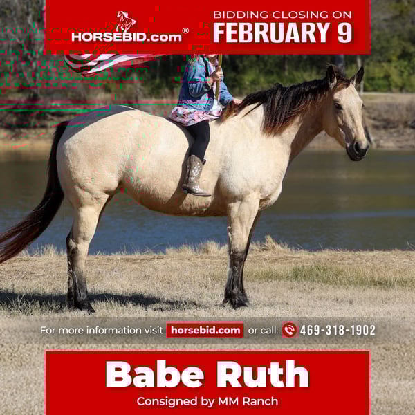 ❤️🔥𝑩𝒆 𝑴𝒊𝒏𝒆 𝐒𝐄𝐋𝐄𝐂𝐓❤️🔥 Happening now thru MONDAY | FEBRUARY 9th - Available EXCLUSIVELY on HorseBid's website! For more details and to register visit: www.Horsebid.com CONSIGNOR CONTACT: MM Ranch 469-318-1902 LOCATION: Forney, TX BREED: Quarter Horse REGISTERED: No REGISTERED NAME: Babe Ruth COLOR: Buckskin HEIGHT: 14.2 AGE: 13 GENDER: Mare Meet Babe Ruth. Yes she is a girl!!! Babe Ruth is just 13 yrs old. She is the perfect fun size of 14.2 hands tall and she is a wide as a house. She would like you to think she is just thick boned. But the fat comments get brought up from time to time. To say she is an easy keeper is an understatement. 💎This girl is as classy and stunning as they make them. Plus she is a bombproof all around type anyone can ride. 💎Has all the fancy bells and whistles. Rides like a reining horse. Can slide to stop. Really spin around if you ask her to. 💎Babe has an old soul, been-there-done-that personality that makes her the go-to for a quiet enjoyable ride. 💎She is both well trained and well behaved in any scenario or discipline. She is quiet and soft to ride in or out of the arena, alone or in a group. Not at all skittish, jumpy or reactive yet sure-footed and nimble through coarse uneven terrain. She has a ground covering walk, a silky smooth jog, and a dreamy lope all on a loose rein or even no bridle at all! Not forward or pushy making her a terrific step up for a novice rider looking for a confidence builder or babysitter to show them the ropes! Very forgiving and patient both on the ground and under saddle. She rides English as well and has been schooled over cross country courses. She ready to go show with endless potential to progress. She has enough of a handle to participate in local fun shows or 4H and also pull her weight around the ranch doing chores. Babe has spent plenty of late nights around the roping pen as well as early mornings trotting out to move cattle. She has been used in the cutting pen to turn back. She can really work a cow. She has so much athletic ability. She is no stranger to a hard days work and is a blast to use! Side passes to open and close gates, rides anywhere in the group, has snubbed colts, drug logs, crosses water, easy to catch wherever you find her, loads and hauls like a dream, stands tied quietly, great for the farrier. Babe is absolutely a favorite among everyone that meets her. I cannot express enough how safe she truly is. This mare wants to please and wants to take care of her rider. She has zero and I mean zero bad habits. You will not get hurt around this mare. Unless you are just drunk and fall off. 😂 Did I mention how stunning she is. She is gorgeous thick made buckskin with big dapples (underneath her winter coat). No warming her up before you get on to ride either. You can get on her fresh out on the pen and go. She is truly a once in a lifetime type horse. 🎉She is a super easy keeper too which is a big plus. She requires no maintenance of any kind. No special feed or supplements. She gets along great with other horses. She is not mean to other horses or marish. You can stall her or turn her out. Doesn’t matter to her. She sells 100% sounds with no issues. She did have a pre vet evaluation done included in the pictures. If you have anymore questions about her feel free to call. We would love to visit with you about her. We can help you arrange shipping anywhere. She is up to date on all vaccinations, worming, had her teeth checked, feet. She is ready to go to her new home to be loved and enjoyed. Don’t miss out on the one. These type amazing horses are sure hard to find.