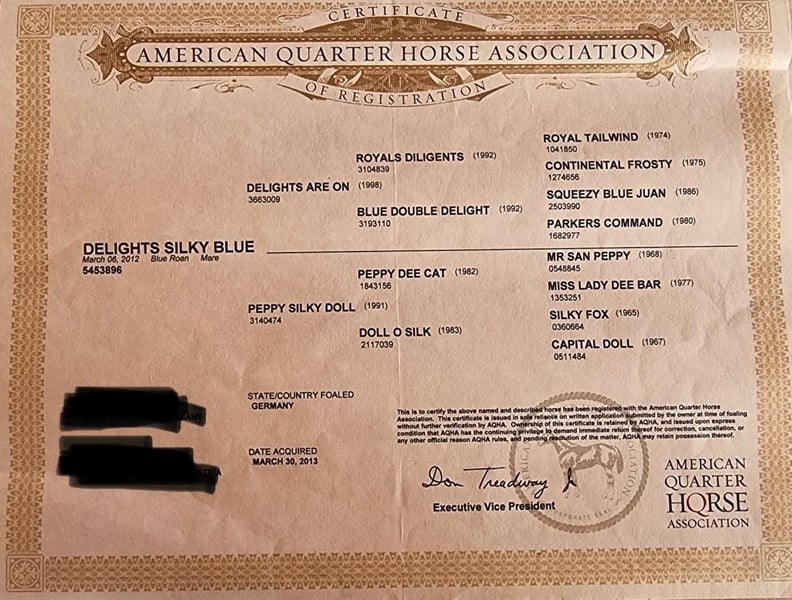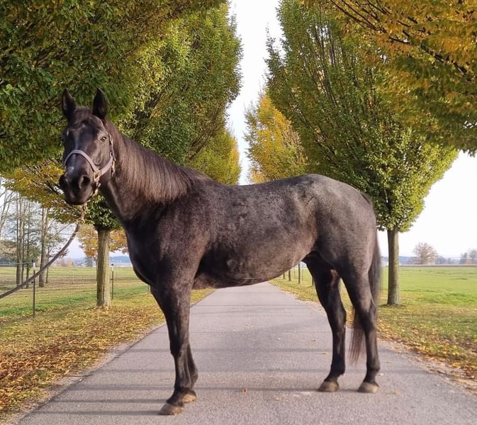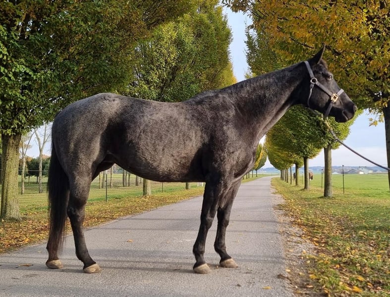 Blue Roan Mare – American Quarter Horse – Loyal Partner for Experienced Riders Seeking a New Home On behalf of the owner, this expressive Blue Roan mare is being offered for sale into a suitable new home. "Blue" is being relinquished due to health and personal reasons and is looking for a sensitive, experienced rider who will continue her training and give her the attention she needs. In recent years, she has been lightly exercised and occasionally ridden; she is currently being conditioned and gymnastically prepared again. She is willing to work, with a beautiful forward movement, yet remains manageable in pace. Not suitable for beginners – she requires a calm hand and clear aids. She is familiar with multiple riders and gets along well with them, but is only suitable for advanced riders. She is uncomplicated and well-behaved in handling. She lives in an open stable, is robust, barefoot, and regularly dewormed. Additionally, she is trail-safe and enjoys hacking out. She has previously foaled a homozygous Blue Roan colt. Thanks to her excellent pedigree and correct conformation, she is also well-suited for breeding (4-panel N/N). We can easily imagine offering her primarily as a broodmare as well. The mare has full AQHA papers. The sale includes a Gomeier Superior saddle (additional cost possible). Height: 15.3 hh Age: 13 years (born March 6, 2012) Location: District Braunau am Inn To help curb riding tourism, a fee of €30 for a trial ride will be charged – this amount will be fully credited against a purchase. Serious inquiries are welcome, and current videos can be provided upon request. Please send a detailed message with information about riding experience and stabling conditions.