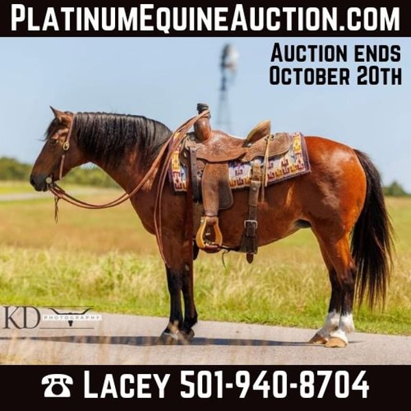 ONLINE AUCTION Place your bids at www.PlatinumEquineAuction.com Starting Bid $3500 Auction ends October 20th, 2024 Need a new saddle? Check out White Rock Saddles on our website or Facebook! Truffles is 12 years old and 12.1H or 49 inches of pure perfection! She is built like a big horse has a kind eye, keen head, big hip, good feet and the absolute best disposition! She is the ideal size and age. This gal is as broke as one gets! She has a nice neck rein, low headset and eager to please. Truffles will stay quiet and honest in any situation and is the “point and go type”. She will cross water, logs, bridges, etc. with zero hesitation and the upmost confidence. She has been ridden many miles outside and in the arena as well. Truffles will accommodate any level of rider without issue and is the same pony every day. She is also finished on the barrels and has been competed on at the fun shows and playdays. She has the sweetest demeanor and impeccable ground manners. She stands quietly tied, easy to tack up, good to bathe and loves attention! She has been put through every test and passed them all with flying colors! Truffles would be a great addition to anyone’s family and is a true joy to own. Located in Quitman, AR. Contact Lacey Wilf 501-940-8704. ONLINE AUCTION Place your bids at www.PlatinumEquineAuction.com Starting Bid $3500 Auction ends October 20th, 2024 Need a new saddle? Check out White Rock Saddles on our website or Facebook!