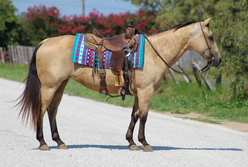 ONLINE AUCTION Place your bids at www.PlatinumEquineAuction.com Starting Bid $3500 Auction ends August 11th, 2024 Need a new saddle? Check out White Rock Saddles on our website or Facebook! They don’t come anymore perfect than this pretty little gal we’re about to Introduce you to ! Butters is a 12 year old buckskin mare standing 14 hds tall . Shes absolutely SAFE for any level rider and will be safe for anyone from 5 to 85 . We trust Butters with everyone ! Butters is the funniest gal to go cruise around on , she’s user friendly and you don’t have to be a cowboy to ride her . She is happy to do whatever you ask of her , she will go out down the trail by herself or in a group . She will cross water , logs , bridges and tarps and whatever else you may come across down the trail with zero hesitation. She is confident all while taking care of her riders . She is the perfect mount for everyone including the littles to enjoy from the trails to arena work . Butters is always a trooper when being rode in town with the heavy traffic , crowds of people and is always the first one to get loved on by everyone . She is the sweetest mare and loves attention always being the first one to greet you in the barn . In the arena she has smooth gaits and transitions . We have gave numerous lessons on her for all levels of riders , she is very forgiving and always try’s 100% to please. She will walk , trot and lope circles , she has a true neck rein on her , moves off of your legs. She is the perfect addition to anyone’s family and not only is she the perfect size she’s Americas favorite color ! She loads and unloads off the trailer great . Stands great to tack up and easy to bridle . Butters is also one you can jump on bareback with a halter and take out for a ride . She clips , ties , stands for the farrier and bathes like a dream. She is truly a unicorn that everyone searches the world for! Call us to schedule a time to come try her out or we can set up a FaceTime call. If you need help with transport don’t hesitate to ask we have a list of reputable haulers that can get her safely to your doorstep world wide. Contact M$ Perf. Horses Michelle 661-817-9120 with any questions. Located in Stephenville, TX. ONLINE AUCTION Place your bids at www.PlatinumEquineAuction.com Starting Bid $3500 Auction ends August 11th, 2024 Need a new saddle? Check out White Rock Saddles on our website or Facebook!