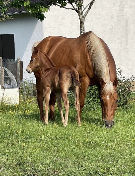 Josy ist eine absolut liebenswerte, menschenbezogene und zuverlässige Stute, die in jeder Hinsicht überzeugt. Sie ist schmiede- und verladefromm, läuft barhuf, ist herdenverträglich und wurde solide grundausgebildet. Im Gelände zeigt sie sich aufmerksam, nervenstark und verkehrssicher – eine Stute, die man sofort ins Herz schließt. Aktuell ist Josy tragend von Arc Surprise Oak, einem erfolgreichen und hochkarätig gezogenen Hengst, dessen Abstammung in der Westernszene einen hervorragenden Ruf genießt. Das Fohlen wird zum 01.05.2026 erwartet. Ein Verkauf mit oder ohne Fohlen ist möglich; bei Abgabe ohne Fohlen reduziert sich der Preis entsprechend. Auf Wunsch kann Josy bei uns vor Ort erneut besamt werden – sie hat bisher immer problemlos beim ersten TG-Versuch aufgenommen. Josy ist völlig unverbraucht und hat bei uns bereits zwei wunderschöne Fohlen in den Sonderfarben Red Roan und Palomino Roan zur Welt gebracht. Sie geht in ihrer Mutterrolle voll auf, beide Geburten verliefen unkompliziert, und ihre Nachzucht ist gesund, korrekt gebaut und charakterlich ein Traum. Stute und Fohlen sind DQHA-prämiert. Beide bisherigen Fohlen leben noch bei uns auf dem Hof und können besichtigt werden. Wir suchen für Josy einen Bestplatz, an dem sie geliebt und wertgeschätzt wird. Sie wird schweren Herzens wegen Zuchtaufgabe abgegeben. Für weitere Informationen oder einen Besichtigungstermin rufen Sie uns gerne an.