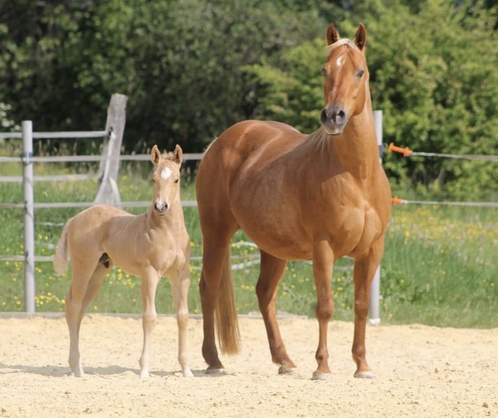 Josy ist eine absolut liebenswerte, menschenbezogene und zuverlässige Stute, die in jeder Hinsicht überzeugt. Sie ist schmiede- und verladefromm, läuft barhuf, ist herdenverträglich und wurde solide grundausgebildet. Im Gelände zeigt sie sich aufmerksam, nervenstark und verkehrssicher – eine Stute, die man sofort ins Herz schließt. Aktuell ist Josy tragend von Arc Surprise Oak, einem erfolgreichen und hochkarätig gezogenen Hengst, dessen Abstammung in der Westernszene einen hervorragenden Ruf genießt. Das Fohlen wird zum 01.05.2026 erwartet. Ein Verkauf mit oder ohne Fohlen ist möglich; bei Abgabe ohne Fohlen reduziert sich der Preis entsprechend. Auf Wunsch kann Josy bei uns vor Ort erneut besamt werden – sie hat bisher immer problemlos beim ersten TG-Versuch aufgenommen. Josy ist völlig unverbraucht und hat bei uns bereits zwei wunderschöne Fohlen in den Sonderfarben Red Roan und Palomino Roan zur Welt gebracht. Sie geht in ihrer Mutterrolle voll auf, beide Geburten verliefen unkompliziert, und ihre Nachzucht ist gesund, korrekt gebaut und charakterlich ein Traum. Stute und Fohlen sind DQHA-prämiert. Beide bisherigen Fohlen leben noch bei uns auf dem Hof und können besichtigt werden. Wir suchen für Josy einen Bestplatz, an dem sie geliebt und wertgeschätzt wird. Sie wird schweren Herzens wegen Zuchtaufgabe abgegeben. Für weitere Informationen oder einen Besichtigungstermin rufen Sie uns gerne an.