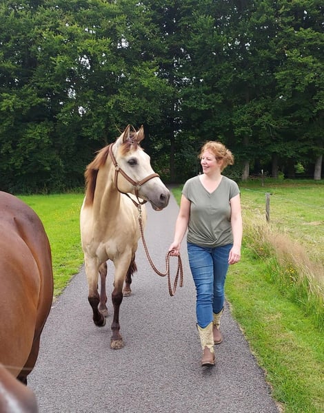 Lieve Quarterhorse merrie van 17 jaar. Lief in omgang, braaf bij hoefsmid, makkelijk te laden. Heeft een stamboom en panel 5 n/n Heeft 2 hele mooie veulens gehad en is een hele lieve moeder. Is reing ingereden, maar hier voornamelijk recreatief gereden, maar kent wel de basis principes van de western/ trail. Is braaf met rijden, ze heeft alleen altijd haast 😅 Heeft helaas atrose aan haar rechter voorbeen, maar hier voor alsnog nog geen last van als ze recreatief gereden wordt. Ook zeer geschikt als weidemaatje, staat hier met twee andere merries. Overdag op wei of paddock en 's nachts op stal. Heeft geen stal ondeugden. Staat niet op ijzers, verder in goede conditie. Gaat alleen weg als het van beide kanten een goede klik is. Voor vragen bel op doe een appje Groetjes J.Immeker