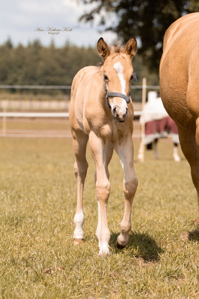 Bingo is a very sweet and strong breeding mare. Absolutely well-behaved in handling and interaction. She is still conditionally rideable by children, as she is slightly behind in her hindquarters, but has no problems otherwise and it does not pass on. Currently, she still has a foal at her side, which can be purchased as well. A photo of the filly is attached. The father of the foal is Rooster's Topgun, by Ricochet Rooster, full brother to Mr. Ricochet.