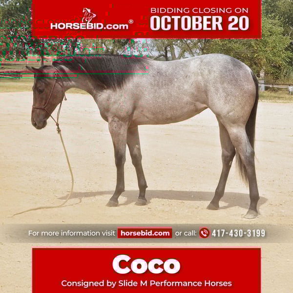 ♦️ 𝐭𝐡𝐞 𝐀𝐌𝐄𝐑𝐈𝐂𝐀𝐍 𝓕𝓪𝓵𝓵 𝓒𝓵𝓪𝓼𝓼𝓲𝓬 ♦️ Happening now thru MONDAY | OCTOBER 20th - Available EXCLUSIVELY on HorseBid's website! For more details and to register visit: www.Horsebid.com CONSIGNOR CONTACT: Slide M Performance Horses 417-430-3199 LOCATION: Mount Vernon, MO BREED: Quarter Horse REGISTERED: Yes REGISTERED NAME: Sleepys Roan Babe COLOR: Bay Roan HEIGHT: 14.3 AGE: 0 GENDER: Filly They don’t come around like this often. Coco is a standout filly, expected to finish around 15.2hh, with the kind of build, bone, and mind that make her a lifelong partner. She’s the total package — smart, sweet, and versatile — and has the size and structure to also be a valuable addition to any riding or broodmare program down the road. Coco is a people lover and always eager to see you, greeting with a nicker every time. She’s quick to learn, enjoys her work, and gives 100% with a willing attitude. Shes done all of the groundwork— she lunges quietly both directions with a walk, trot, and lope, crosses tarps, bridges, water, and mud with confidence, and ponies off other horses without hesitation. She’s been hauled and exposed to new places and handles every sight and sound with a calm, steady mind. This filly has impeccable manners — she ties quietly, stands for grooming and farrier work, picks up all four feet, loads and unloads with ease, loves baths and is even safe to be handled by young kids. Whether in the pasture or in a stall, Coco is content and never buddy or barn sour. On top of all that, she’s a fluid, athletic mover with the talent to excel in any direction. Backed by proven bloodlines producing strong, dependable riding and rope horses. Already built stouter than most mature quarter horses, Coco is guaranteed to be a looker when she grows up. Truly a one-of-a-kind prospect — Coco is ready to be your partner for the future.