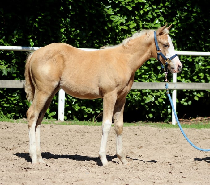Zum Verkauf steht eine außergewöhnlich gezogene American Quarter Horse Stute, geboren am 10. April 2025, die in jeder Hinsicht höchste Ansprüche erfüllt. Diese junge Stute vereint erstklassige Genetik, modernes Exterieur und ein vielversprechendes Mindset für den Reining-Sport sowie für die hochwertige Zucht. In ihrer auffälligen Palomino Splash-Farbe mit breiter weißer Blesse ist sie nicht nur ein Blickfang, sondern präsentiert sich bereits jetzt mit harmonischem Körperbau, klaren Linien und einem geschätzten Endmaß von ca. 151 cm – ideal für den modernen Reining-Typ. Pedigree Der Vater TINKER WITH GUNS gehört mit zu der Weltspitze der Reining-Vererber. Als NRHA Million Dollar Sire ($1.254.000) mit eigenen Lifetime Earnings von $346.366 steht er für Leistungsbereitschaft, Trainierbarkeit und Champion-Mentalität. Seine Erfolge sprechen für sich, darunter mehrere NRHA- und NRBC-Derby-Titel sowie ein NRHA Open Derby Champion-Titel. Die Mutterlinie ist ebenso exquisit: Über YELLOROSEOFTEXAS führt das Pedigree direkt zu GALLO DEL CIELO, einem der einflussreichsten Hengste der Westernreitgeschichte. Als NRHA 4 Million Dollar Sire und NCHA Million Dollar Sire sowie Vollbruder zu Grays Starlight steht er für Vielseitigkeit, Vererbungskraft und nachhaltigen Erfolg in Reining, Cutting und Cow Horse. Nominierungen & Gesundheit Diese Stute ist genetisch 5-Panel N/N (PSSM, GBED, HERDA, MH, HYPP) und somit bestens für Sport und Zucht abgesichert. Sie ist nominiert für: NRHA Germany SSP NRHA Belgium Sire & Dam (über den Vater) EURO Futurity & Derby SilverSpurs Million Dollar Challenge (Germany, Italy, Austria & Euro Futurity) Charakter & Perspektive Neben ihrer genetischen Exzellenz überzeugt diese Jährlingsstute durch einen freundlichen, aufgeschlossenen und menschenbezogenen Charakter. Sie zeigt sich aufmerksam, korrekt im Umgang und mit der natürlichen Präsenz, die man bei zukünftigen Spitzensport- und Zuchtpferden sucht. Ein hochwertiges Prospect für Reining auf internationalem Niveau – ebenso interessant für ambitionierte Züchter, die Wert auf bewährte Blutlinien, Nominierungen und langfristige Qualität legen. Eine weitere Aufzucht bei uns ist nach Absprache gerne möglich. 📍 Besichtigungen nach Vereinbarung www.white-diamond-horses.de
