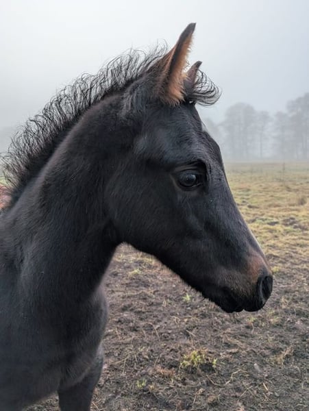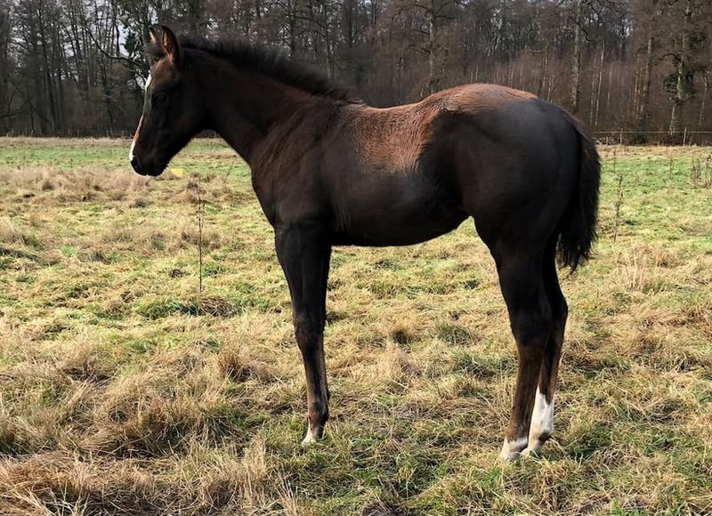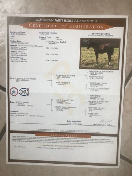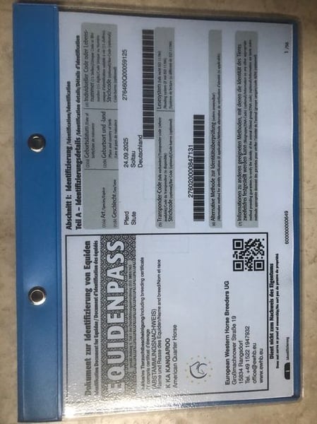 K Ka Kangaroo is a harmonious, affectionate filly with correct conformation and a solid foundation, sporting a black-brown coat. She holds papers from AQHA & APHA and is genetically tested via her parents, with 6 Panel N/N. A notable feature upon closer inspection are her blue-rimmed eyes, suggesting she may carry the color gene. Known as Kay, she exhibits expressive, elastic, and energetic movement and is curious about her environment and very people-oriented. Kay is raised in a small herd, ensuring she is well socialized. She has been regularly handled by the blacksmith, dewormed regularly, and has her equine passport. I envision her as a fantastic partner for leisure riding with potential for high-level competition in the show arena. The last four pictures show her parents (mother Sorrel & father Brown). UPDATE: Her sire, JJ Shining Footwork, recently won the EWU Young Horse Reining at his first competition during the Easter weekend and placed 3rd in Ranch Riding.