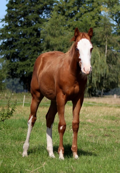 Custom Splash, geboren am 19.03.2025 mit einem Endmaß von ca. 150-153 cm, ist eine außergewöhnliche Sorrel Splash Quarter Horse Stute, die sofort ins Auge fällt. Mit ihrem markanten, ausdrucksstarken Gesicht, dem auffälligen blauen Auge links und dem partiell blauen Auge rechts sowie ihrer Fellzeichnung zieht sie alle Blicke auf sich - ein echtes Pferd, das im Gedächtnis bleibt. Ihr großrahmiger, moderner Körperbau, die perfekte Bemuskelung und die harmonische Balance spiegeln ihre natürliche Athletik und Leistungsbereitschaft wider. Sie zeigt von Natur aus Talent für Reining: elegante Körperkontrolle, eine angenehme Selbsthaltung und bemerkenswerte Balance machen sie zu einem vielversprechenden Prospect für ambitionierte Reiter (Non Pro und Open). Doch nicht nur ihr äußerer Auftritt und ihr Potenzial machen sie besonders - Custom Splash überzeugt auch durch ihren Charakter. Sie ist neugierig, aufgeschlossen und sehr menschenbezogen. Ruhig, entspannt und verschmust geht sie auf Menschen zu und lernt schnell Neues. Halfterführig, vertraut mit dem Fohlen-ABC, an Hufegeben, Putzen, Tierarzt- und Hufschmiedbesuche gewöhnt, zeigt sie von Anfang an ein vorbildliches Verhalten. Aufgewachsen im Herdenverband, kennt sie sowohl Box- als auch Offenstallhaltung und erhält eine ausgewogene Fütterung mit Aufzuchts- und Mineralfutter. 5-Panel und Mhym n/n. Sie ist NRHA Germany SSP eingezahlt. Custom Splash ist nicht nur ein Pferd mit herausragendem Reining-Potenzial, sondern auch ein echter Eyecatcher mit erstklassiger Abstammung (Custom Crome x Gunners Last Oak). Sie ist die Stute, die im heutigen Reining-Sport gefragt ist, und bietet sowohl ambitionierten Reitern als auch Züchtern die perfekte Kombination aus Leistung, Ausstrahlung und großrahmigem Typ. Die Abgabe erfolgt direkt vom Züchter - hier wartet ein einmaliges Pferd, das sowohl im Sport, in der Zucht oder als Freizeitpartner begeistern wird. Preis inkl. USt. absetzbar.