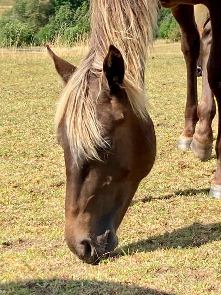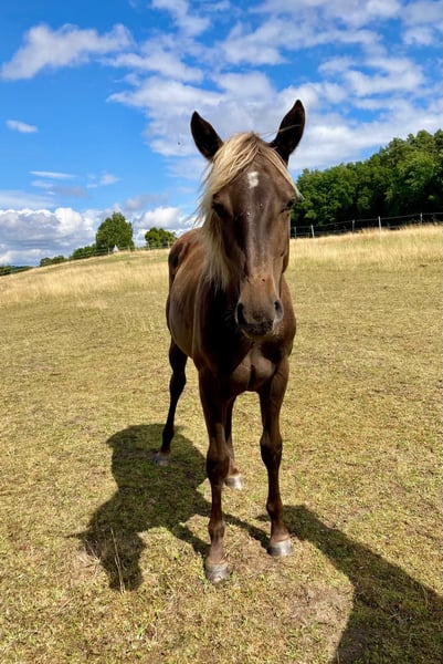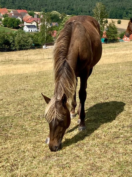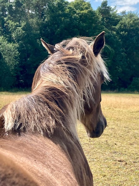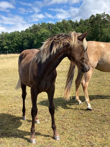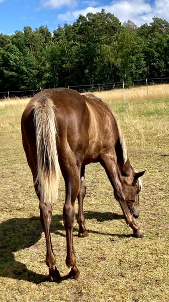 Dads Silver Princess -- da ist der Name Programm. Die Quarter Horse Stute ist eine kleine Prinzessin. Erst etwas schüchtern, aber wenn man sie für sich gewonnen hat, geht sie mit einem durch dick und dünn. Sissi weiß ganz genau, was sie will. Der Jährling ist 5.24 geboren und wird ein geschätztes Endmaß von 150 bis 155 cm bekommen. In der tollen Farbe silver bay, E/E und A/a. Sie wird eher großrahmig. Sissi liebt es im Galopp unterwegs zu sein und kann sich super bewegen. Daher auch sehr interessant für Working Equitation. Sie wächst mit Gleichaltrigen auf und kennt bei Abgabe das Fohlen 1×1. Die Stute hat einen Foundationanteil von 87 %. Der Vater ist der Silver Dapple QH Hengst Silver Apache Joe, 11,7 % Hancock gezogen. Sissis Mutter ist ebenfalls Hancock gezogen. Ein absoluter Eyecatcher für Freizeit und mehr. Inklusive einer Lebensversicherung.