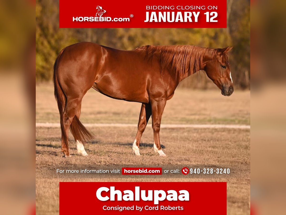 ♦️𝐍𝐄𝐖 𝐘𝐄𝐀𝐑'𝐒 𝑬𝒙𝒕𝒓𝒂𝒗𝒂𝒈𝒂𝒏𝒛𝒂♦️ Happening now thru MONDAY | JANUARY 12th - Available EXCLUSIVELY on HorseBid's website! For more details and to register visit: www.Horsebid.com CONSIGNOR CONTACT: Cord Roberts 940-328-3240 LOCATION: Waco, TX BREED: QH REGISTERED: Yes REGISTERED NAME: CHALUPAA COLOR: Sorrel HEIGHT: 14 AGE: 3 GENDER: Mare