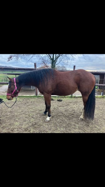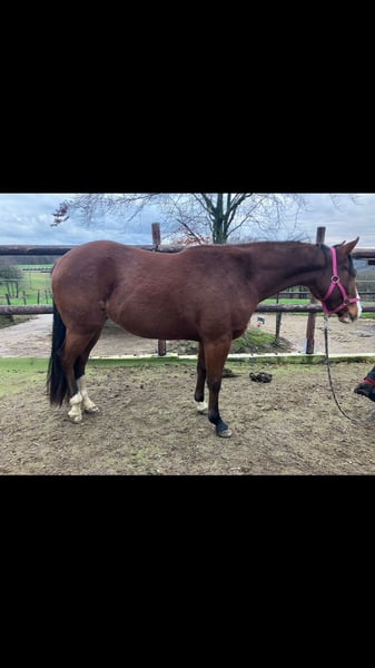 Verkaufe meine 3 Jahre alte Quarterstute. Ich habe sie als Absetzer gekauft , seitdem lebt sie im Offenstall bei mir in einer gemischten kleinen Herde. Sie kennt Hufschmied, Spaziergänge, Handpferdearbeit und drehte ihre ersten Runde mit Sattel und Trense. Sie hat gelegentlich Probleme mit den Kniebändern, laut mehreren Tierärzten sollte ich erstmal abwarten und vorsichtig mit Muskelaufbau beginnen. Seit dem Herbst hustet sie gelegentlich. Auch das wurde mehrfach tierärztlich vorgestellt. Der Preis ist absolut verhandelbar.
