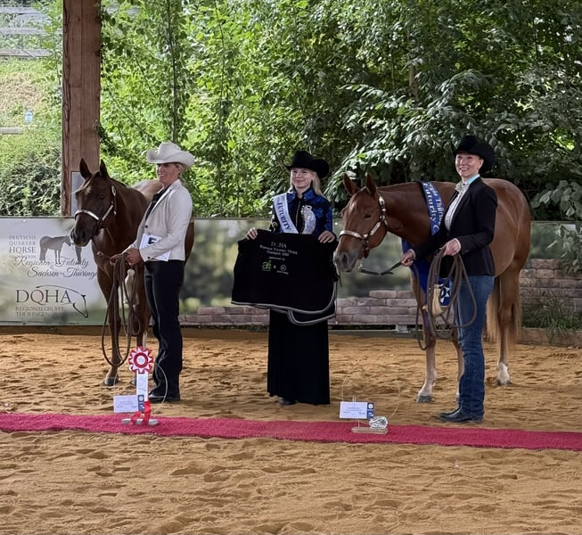 Verkaufe American Quarter Horse Stute – Dunkelfuchs, geb. 2023 Diese wunderschöne zweijährige Stute ist von Unxpected aus einer direkten Blazing Hot Stute. Ihr Endstockmaß wird ca 160 betragen. Sie ist bei mir geboren genauso wie 4 ihrer Halbgeschwister. Alle zeichnen sich aus durch ihren lieben unerschrockenen Charakter und die leichte Trainierbarkeit. Die Geschwister laufen erfolgreich im Sport. Ein Halbbruder ist grade Maturity, DQHA und NSBA Champion Hunter under Saddle auf der Q25 geworden. Phoebe wurde bisher an der Hand trainiert. Sie ist ready to Show in Trail in Hand und Longeline. Im Sommer wurde sie Reserve-Futurity Champion in der Longeline und Co-Reserve Champion im Trail. Sie ist schmiede- und verladefromm, regelmäßig geimpft und entwurmt. Aktuelle Röntgenbilder ohne Befund liegen vor.