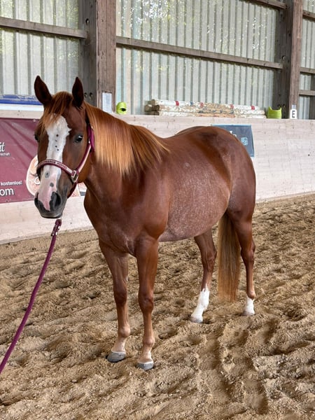 For sale is a promising American Quarter Horse mare, born in 2022. This young lady impresses not only with her eye-catching chestnut color, but also with her friendly nature and her potential as a versatile Western all-round horse. This mare is ideal for riders looking for a talented horse for various western disciplines. She is willing to learn and is ready to take on new challenges with her future owner. If you are looking for a young horse with great potential that will cut a fine figure in both leisure and sport, then this mare could be just right for you. For more information or to arrange a viewing, please contact us. We look forward to hearing from you!