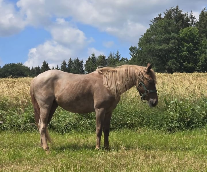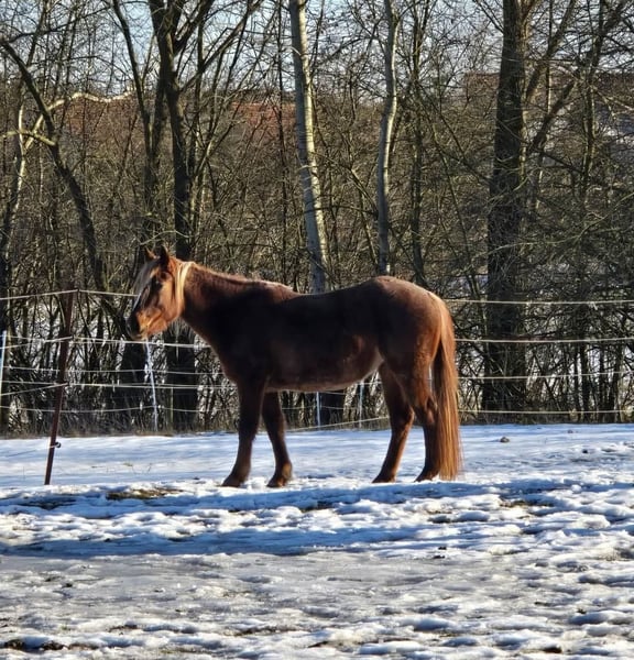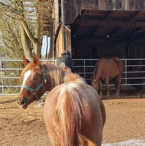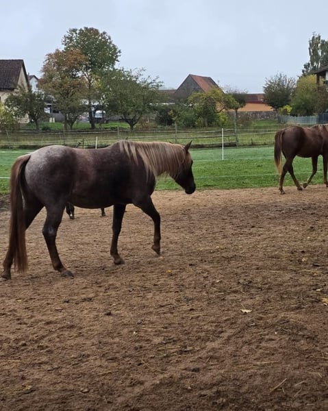 Qualitätsvolle Quarter Horse Nachwuchsstute – mit besonderem Charakter! Mit „El Toptime“ geben wir eine junge Quarter Horse Stute ab, die uns vor allem durch eines überzeugt hat: ihren außergewöhnlichen Charakter. Geboren am 08.06.2022, haben wir sie direkt vom Züchter aus Frankreich geholt und seitdem mit viel Ruhe und Gefühl aufgezogen und vom Boden aus gearbeitet. Sie durfte in ihrem Tempo wachsen und sich entwickeln – genau das spiegelt sich heute in ihrem Wesen wieder. El Toptime ist ein Pferd, das man nicht jeden Tag findet: sehr menschenbezogen, ehrlich und mit einem „Herz aus Gold“. Sie sucht aktiv die Nähe, folgt ihrem Menschen aufmerksam und bleibt auch in neuen Situationen ruhig und gelassen. Abstammung: Woodys Time × Blazing Topsail → solide Grundlage für eine vielseitige Zukunft Auch im Herdenverband zeigt sie sich absolut unkompliziert: Sie kennt sowohl gemischte Gruppen als auch die Haltung in einer Stutenherde (aktuell 7 Pferde) und bewegt sich dort im mittleren Rang. Hier immer im Offenstall gehalten. Eckdaten: ▪️Stute in Red Roan ▪️ca. 1,36 m Stockmaß aktuell leicht überbaut, wächst gerade ▪️5-Panel N/N ▪️bisher nie krank gewesen ▪️kleine Fehlstellung vorne rechts ( keine Einschränkungen) der Huf ist leicht nach außen gestellt. ▪️noch nicht angeritten ▪️kennt es als Handpferd mit ins Gelände zu gehen. Die Entscheidung fällt uns nicht leicht aber wir hatten einfach auf ein paar Zentimeter gehofft – daher suchen wir nun einen passenden Menschen, der genau ein solches Pferd zu schätzen weiß. Wir wünschen uns für Sie das richtige Zuhause, in dem ihr Charakter gesehen wird und sie weiter gefördert wird. Absolut kein Notverkauf!